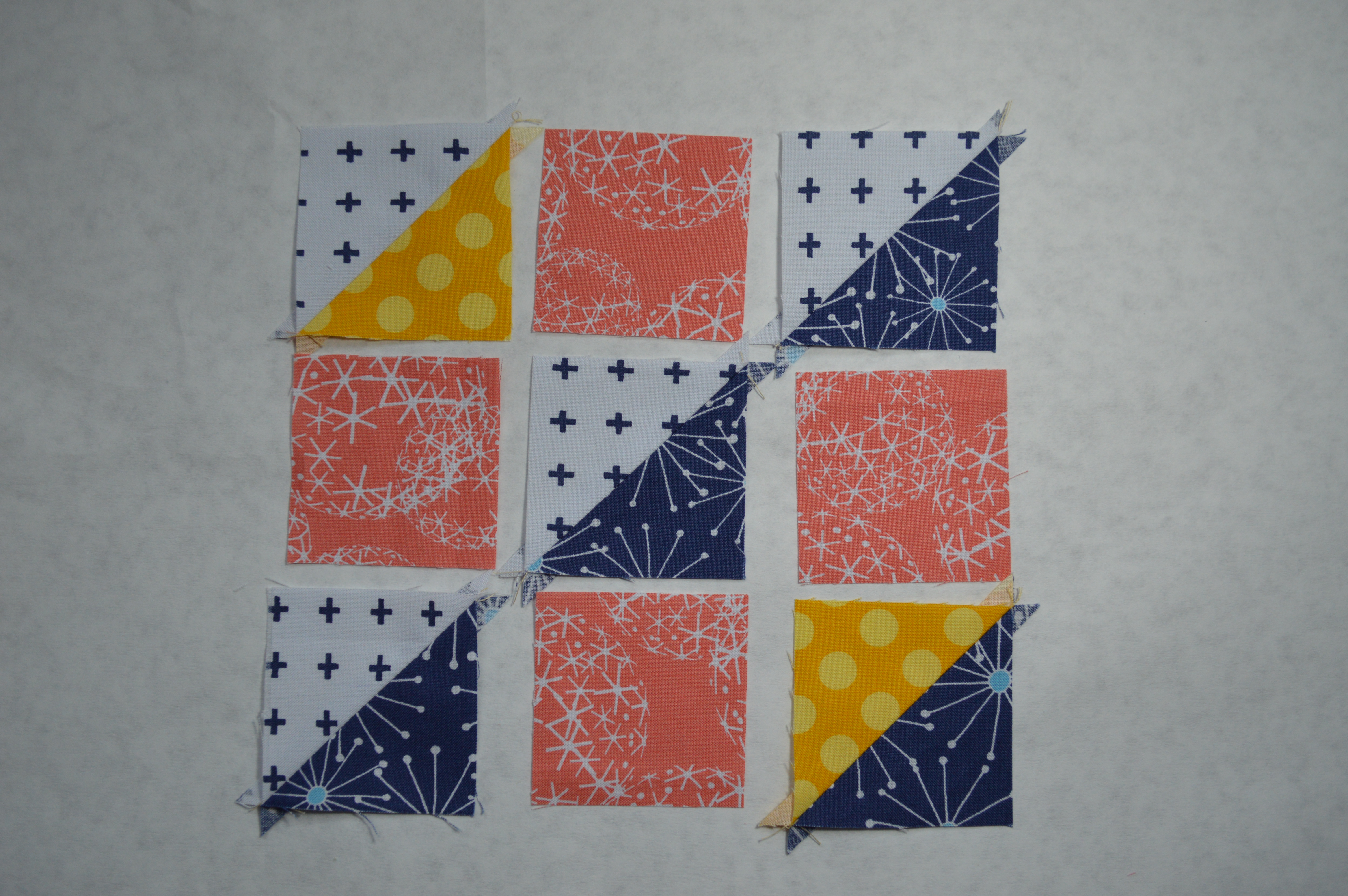 3. Arrange the fabric pieces in three rows as shown above. Sew the HST units to the pink squares to form the rows. Pay close attention that the HST units are oriented correctly. Press toward the pink.