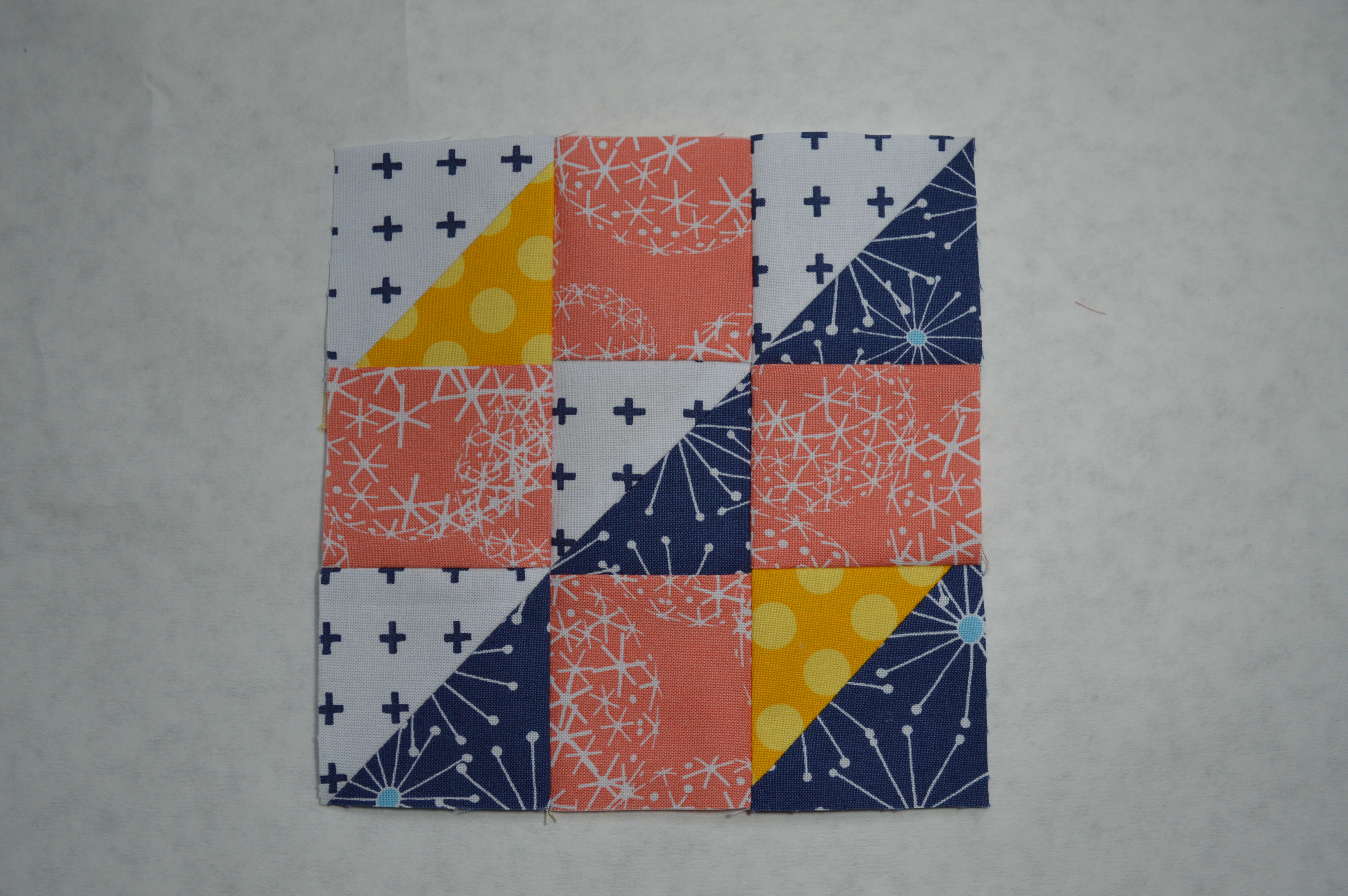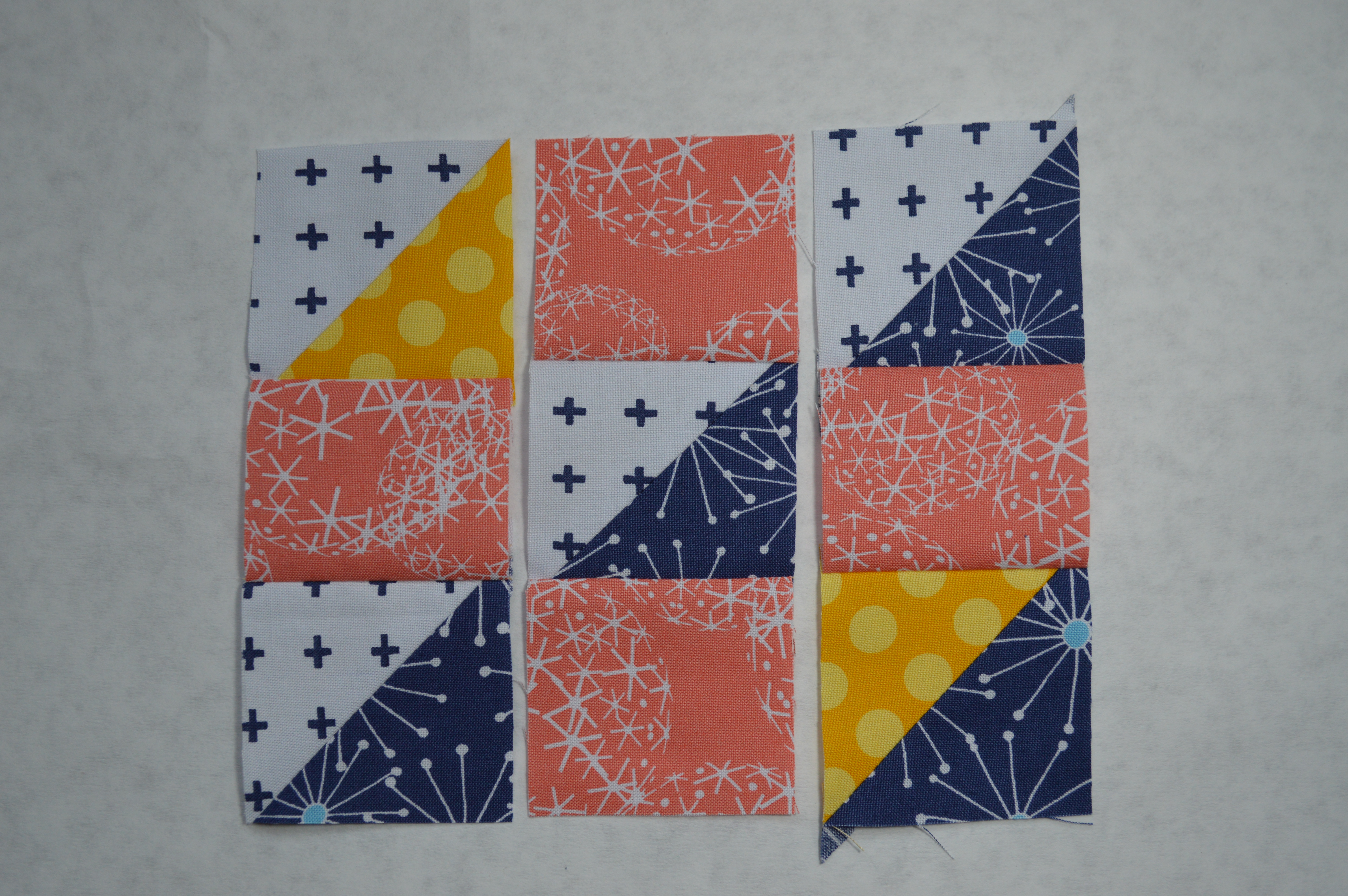 from each of the light gray and dark blue prints: (2) 3″ squares, cut diagonally to yield four half square triangles of each color.