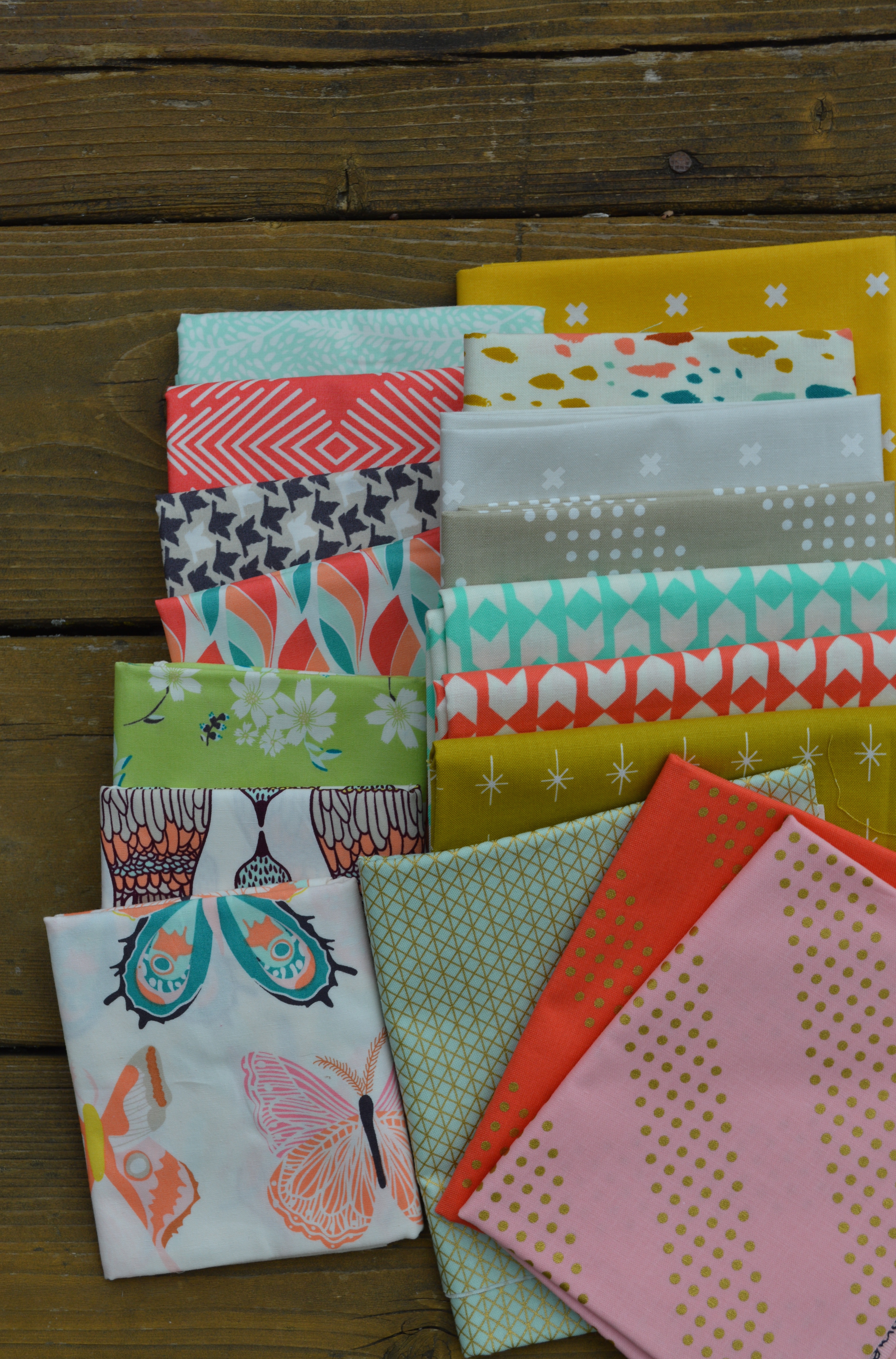 Below, I chose some of the novelty prints from Winged and added some basic geometrics, Mochi dots (linen/cotton blend by Moda Fabrics) and some shot cottons (you could also use solids).