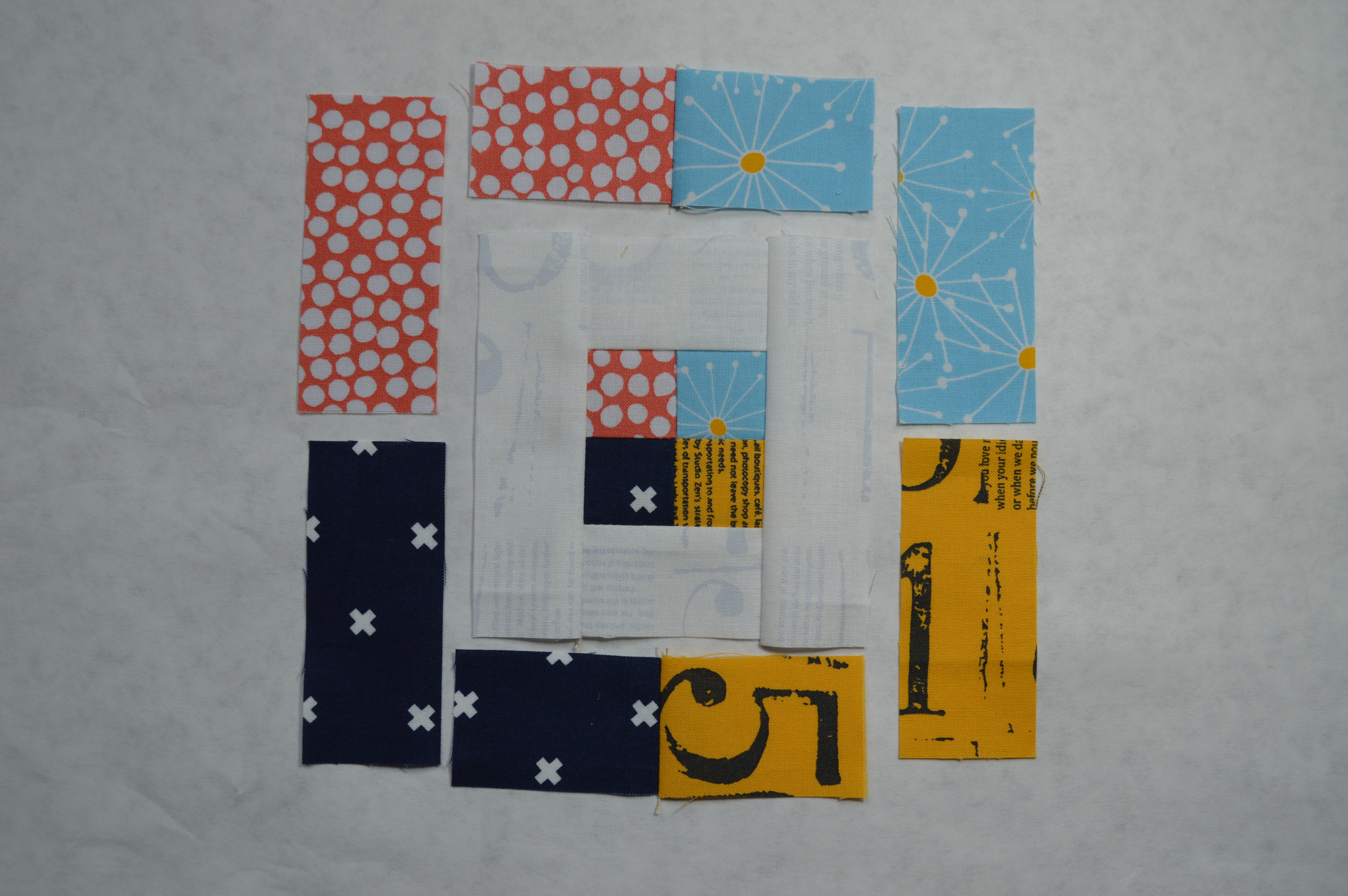 7. Sew the two units made in steps 5-6 to opposite sides of the center square unit. Arrange so the colors are on the same sides as the corresponding square in the center. Press.