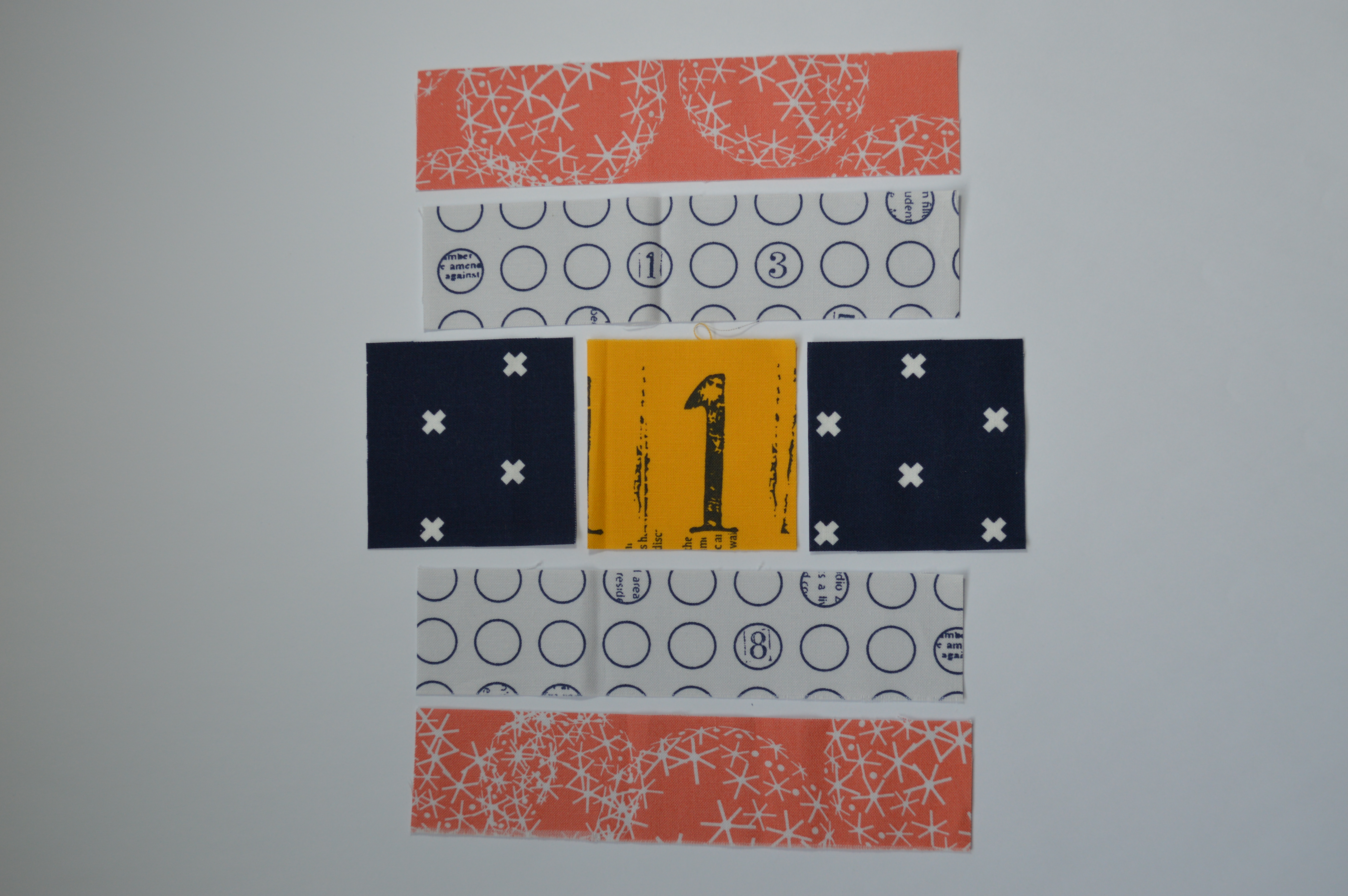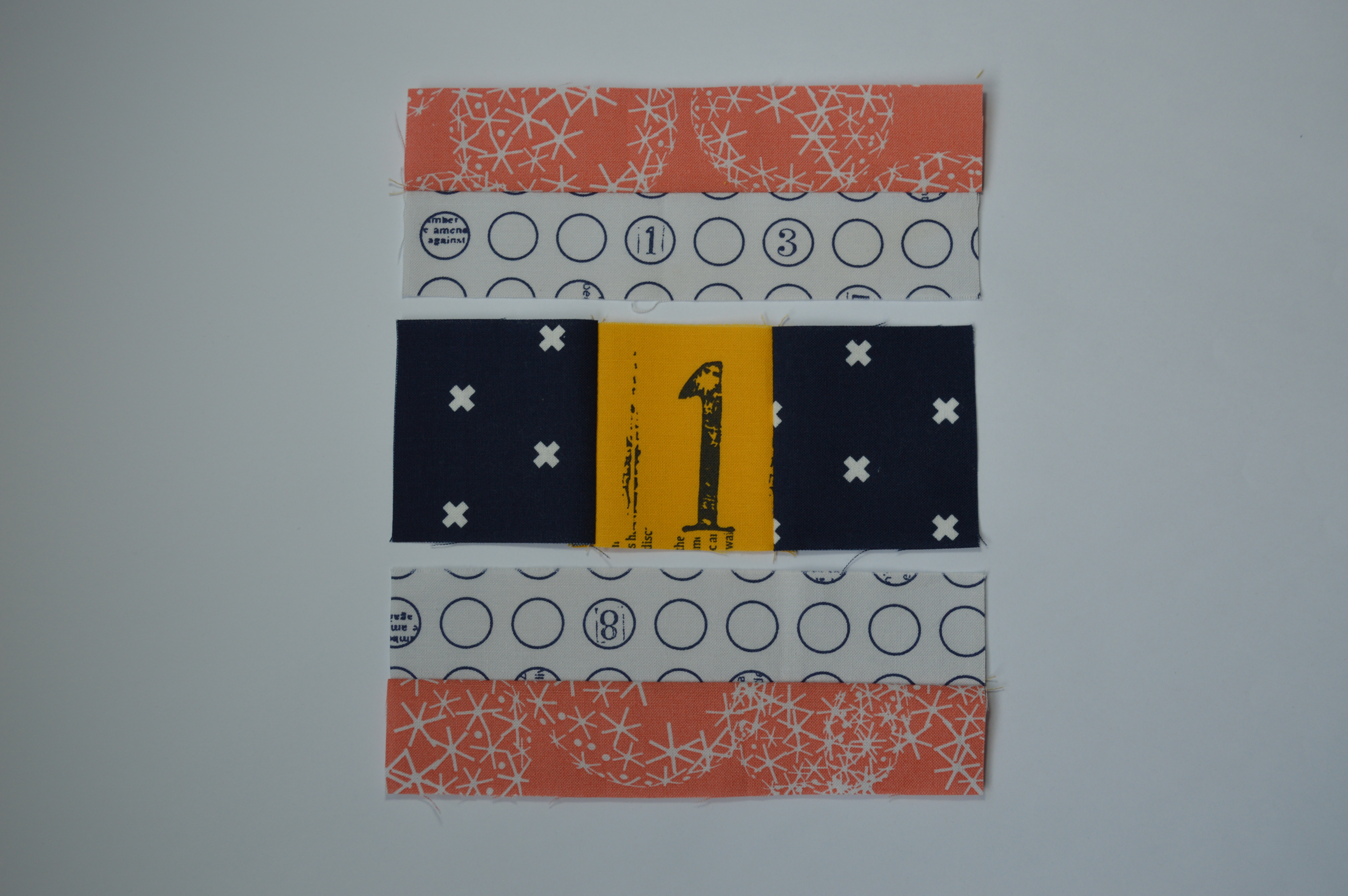 2. sew the navy blue squares to opposite sides of the yellow square. Press toward the blue.