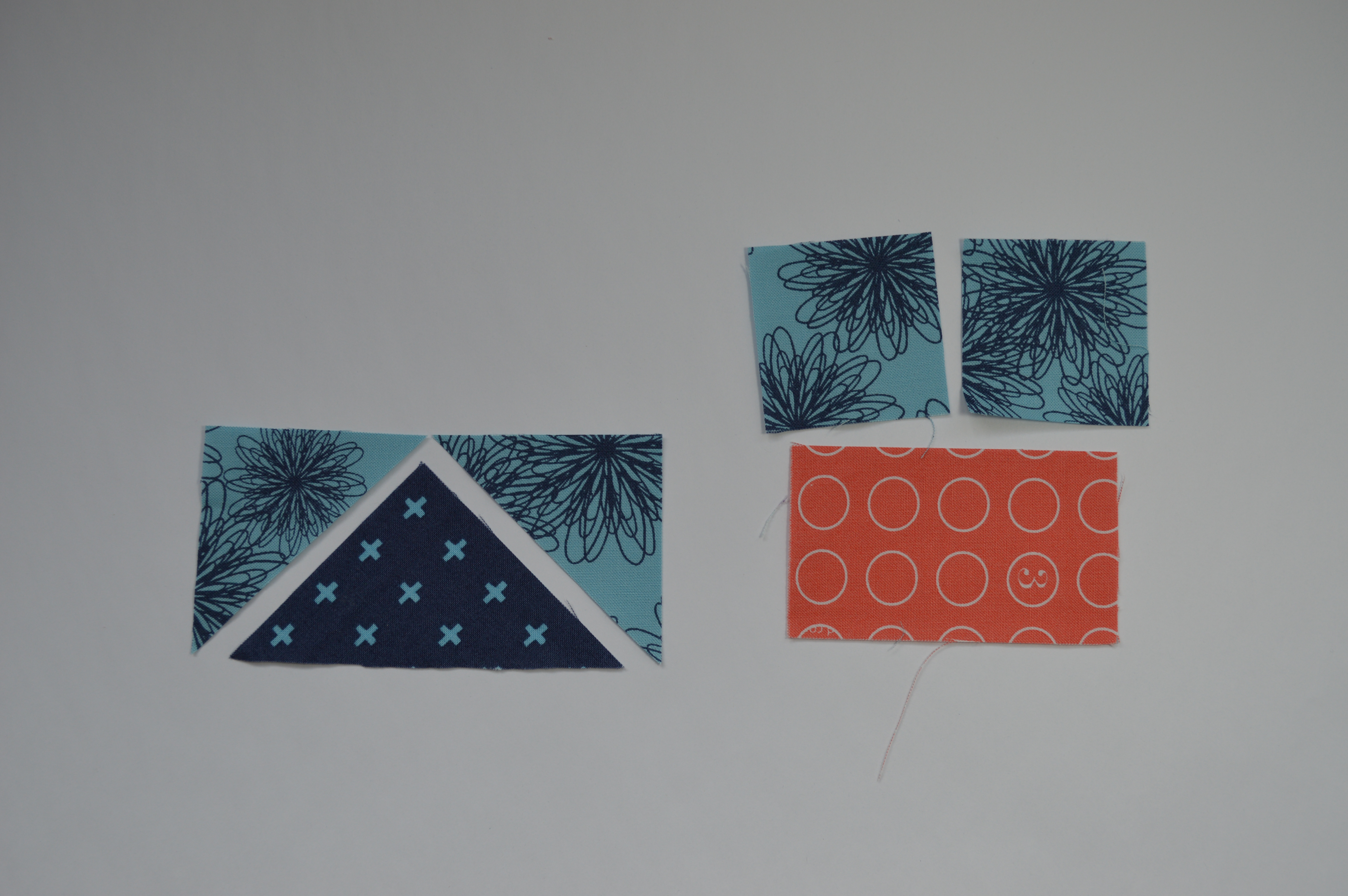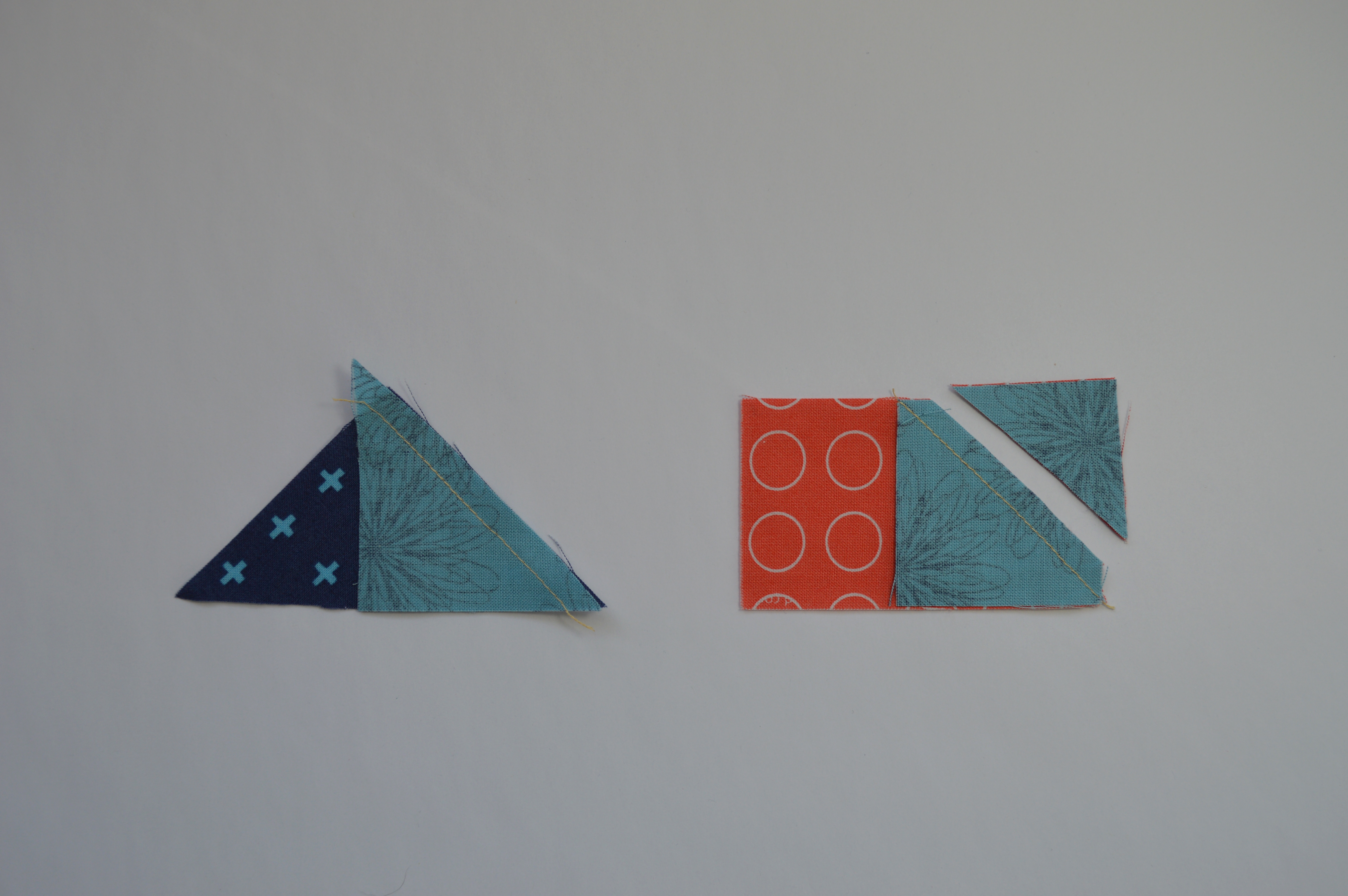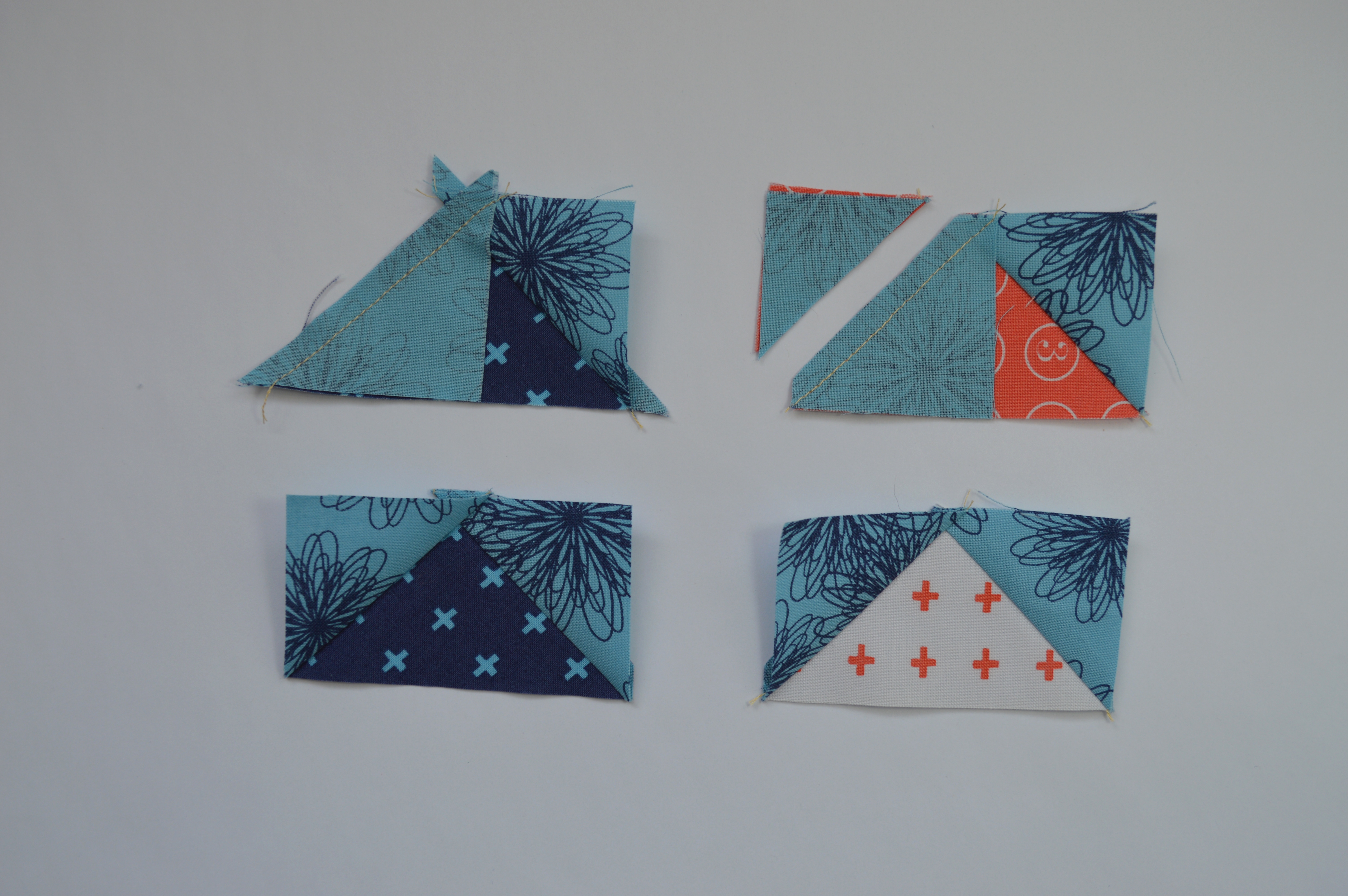 1. See photo above. Triangle method: each flying geese unit will require two light blue HST and one 4 1/4″ QST (left); square method: each flying geese unit requires two light blue squares (2″) and one 3 1/2″ x 2″ rectangle.