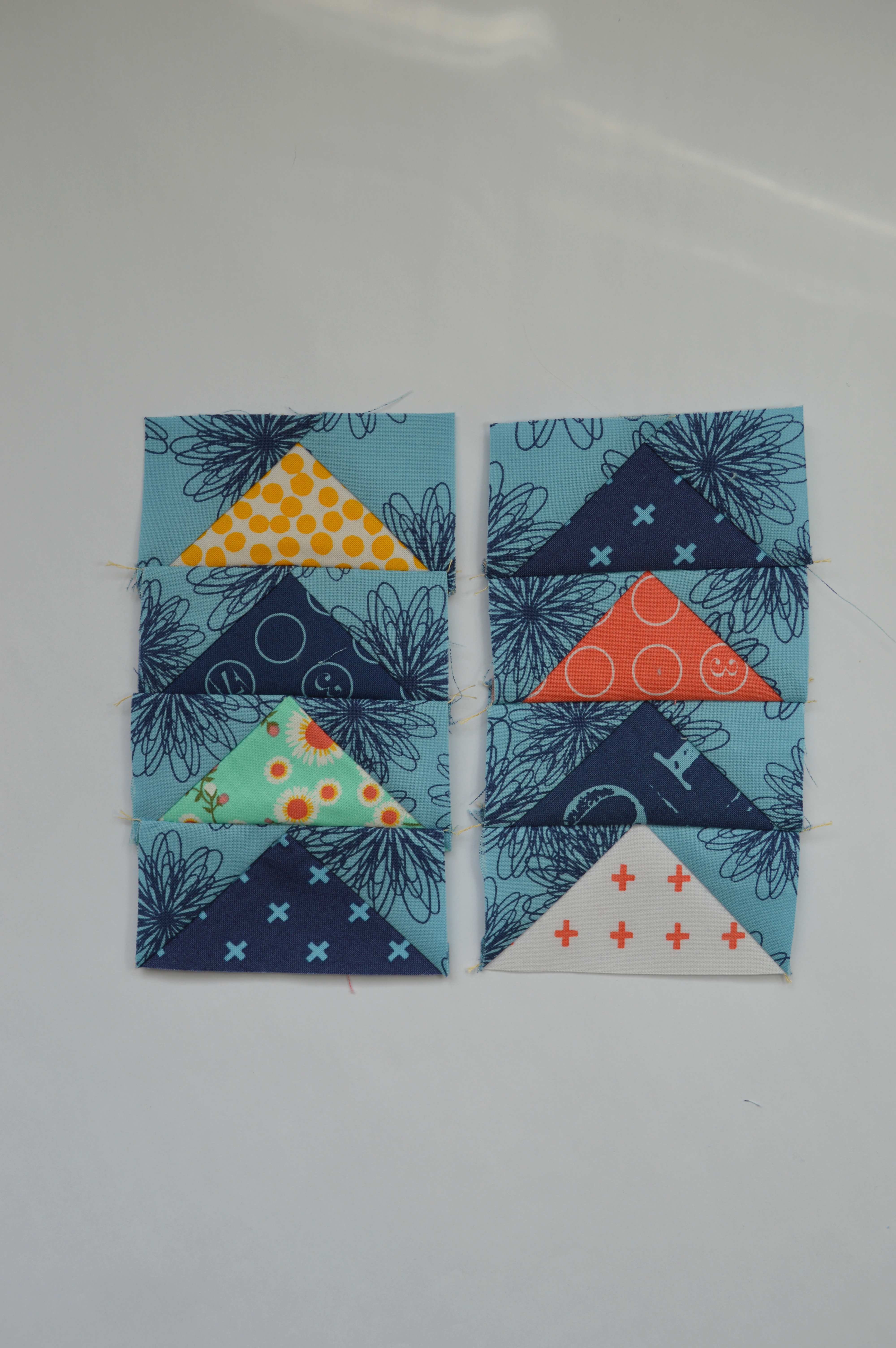 from the light blue print, cut 8 squares 2 1/2″, then cut in half diagonally to yield 16 half-square triangles (HST)