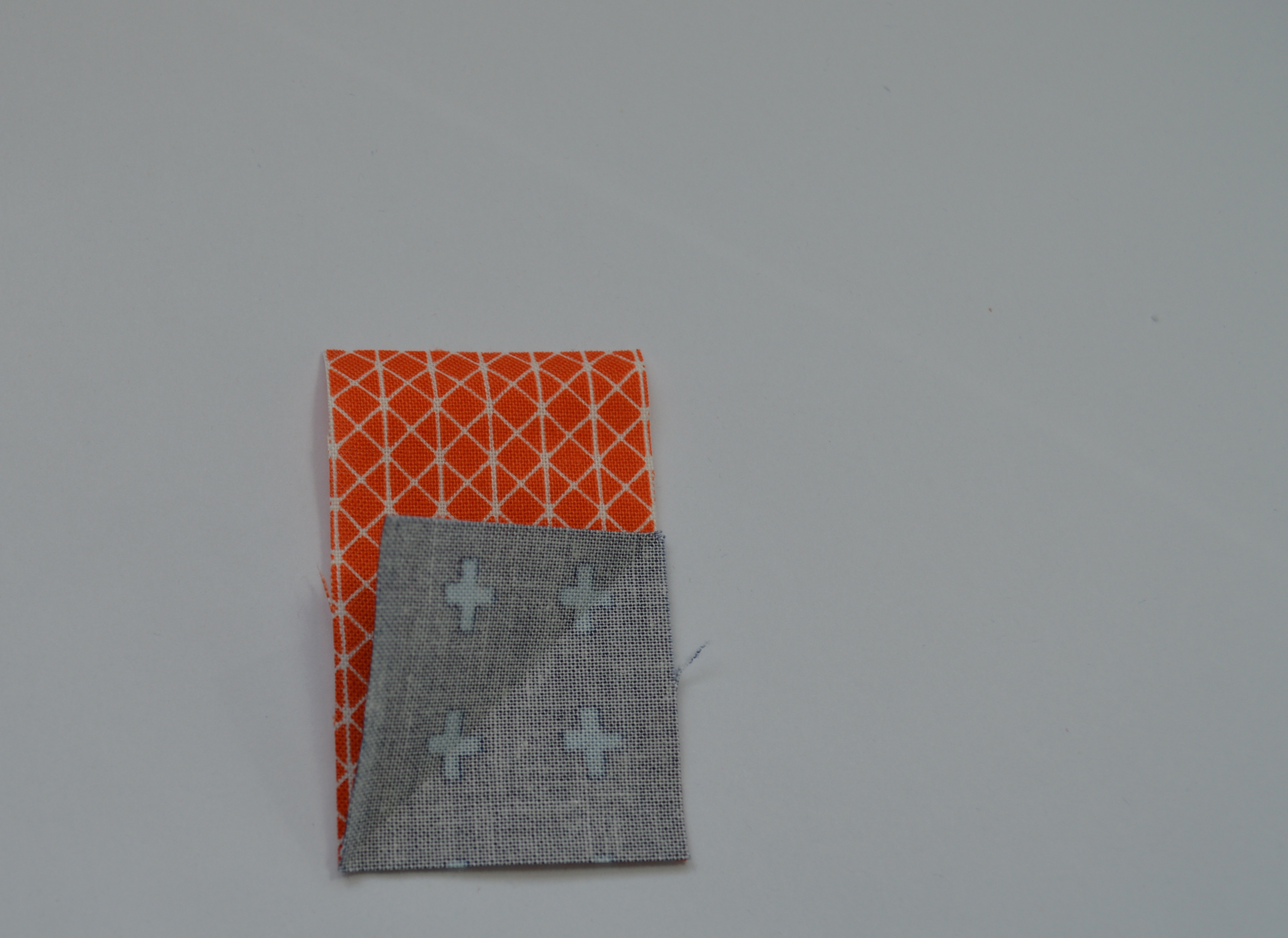 1. Place a dark blue 1 1/2″ square right sides facing a pink rectangle, so the square covers just one end of the rectangle.