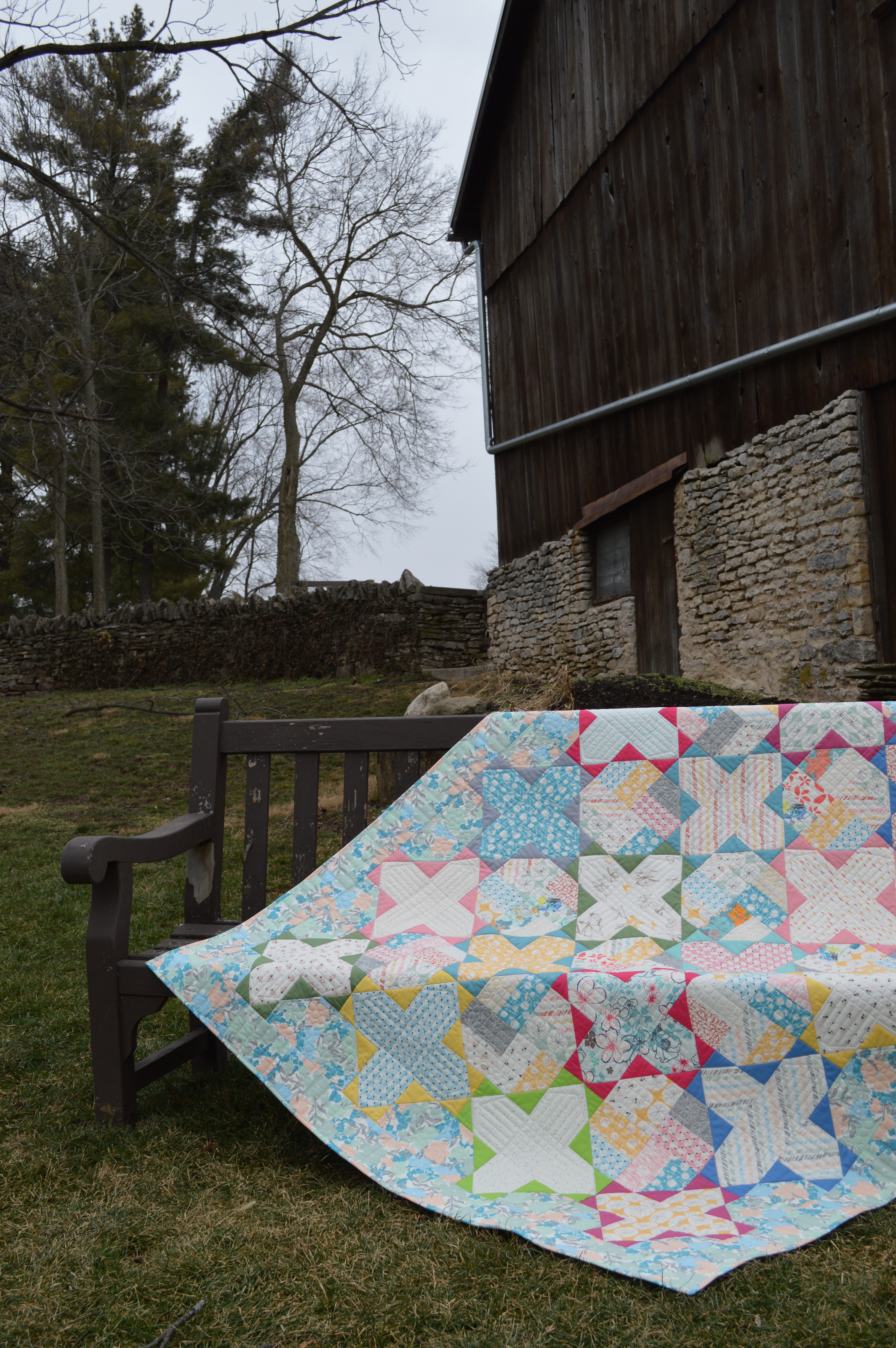 I have a finished quilt to share! Miracle, huh? I am really proud of this quilt, the beauty of the colors and prints and the fun patchwork design. I made the Gossamer quilt in January for Quilt Now magazine and it appears in the newest issue going to subscribers now in the UK and hopefully coming to us the U.S. pretty soon.