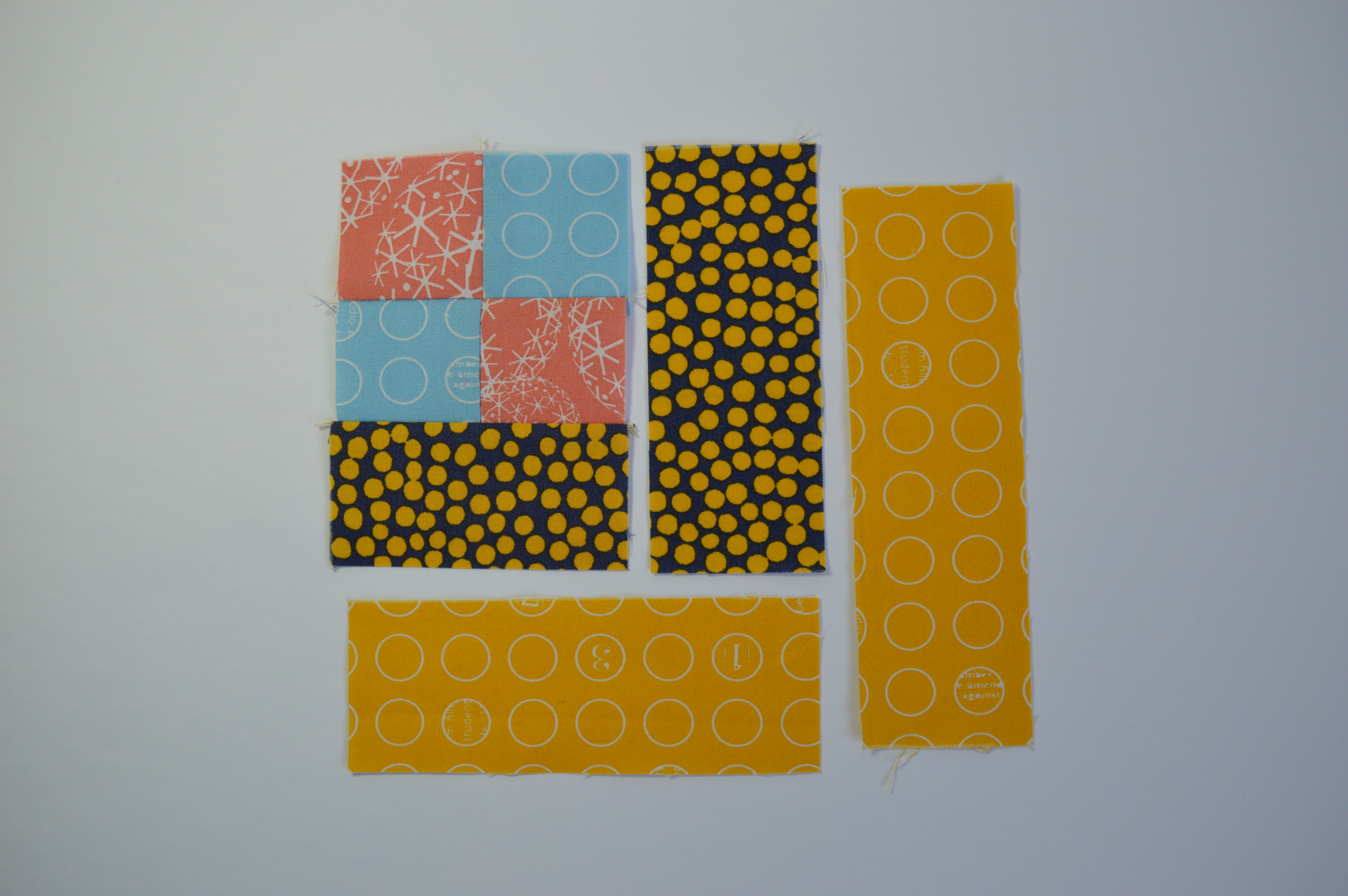 4. Sew the dark yellow 2″ x 5″ rectangle to the right side of the four patch (adjacent to the first yellow rectangle as shown above). Press toward the yellow.