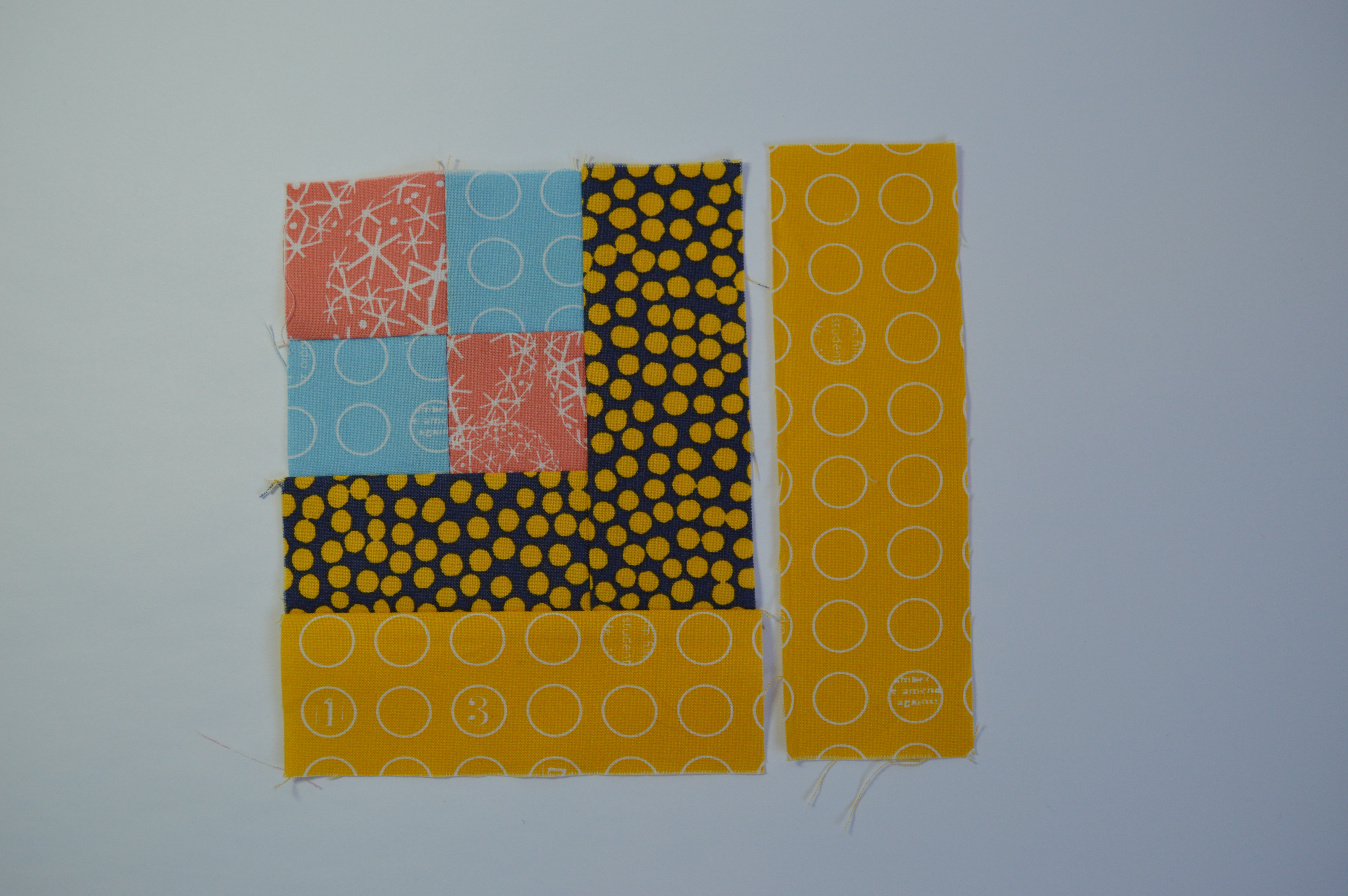 3. Sew the 3 1/2″ x 2″ dark yellow rectangle to the bottom side of the four patch. Press toward the yellow.