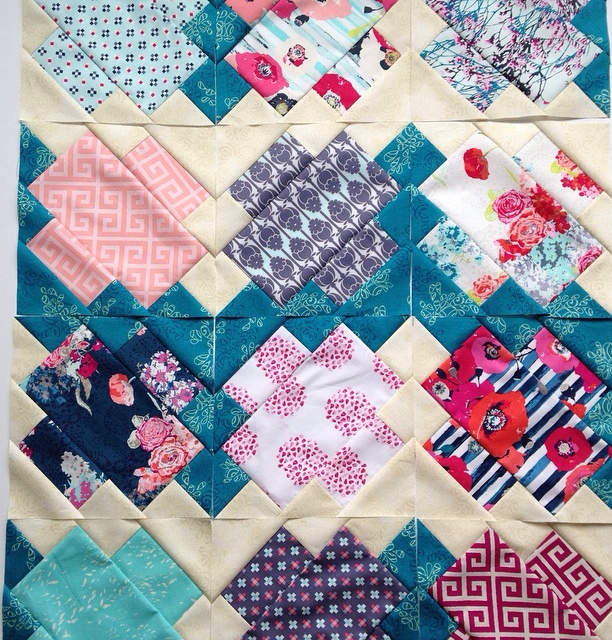The fun thing about these blocks is that there are so many ways you can put them together and create secondary patterns with the turquoise and cream background prints (see the original, done in black and white, Here). The Skopelos prints look gorgeous in these simple blocks, really showing off the pretty florals and geometrics…and those colors! so rich.