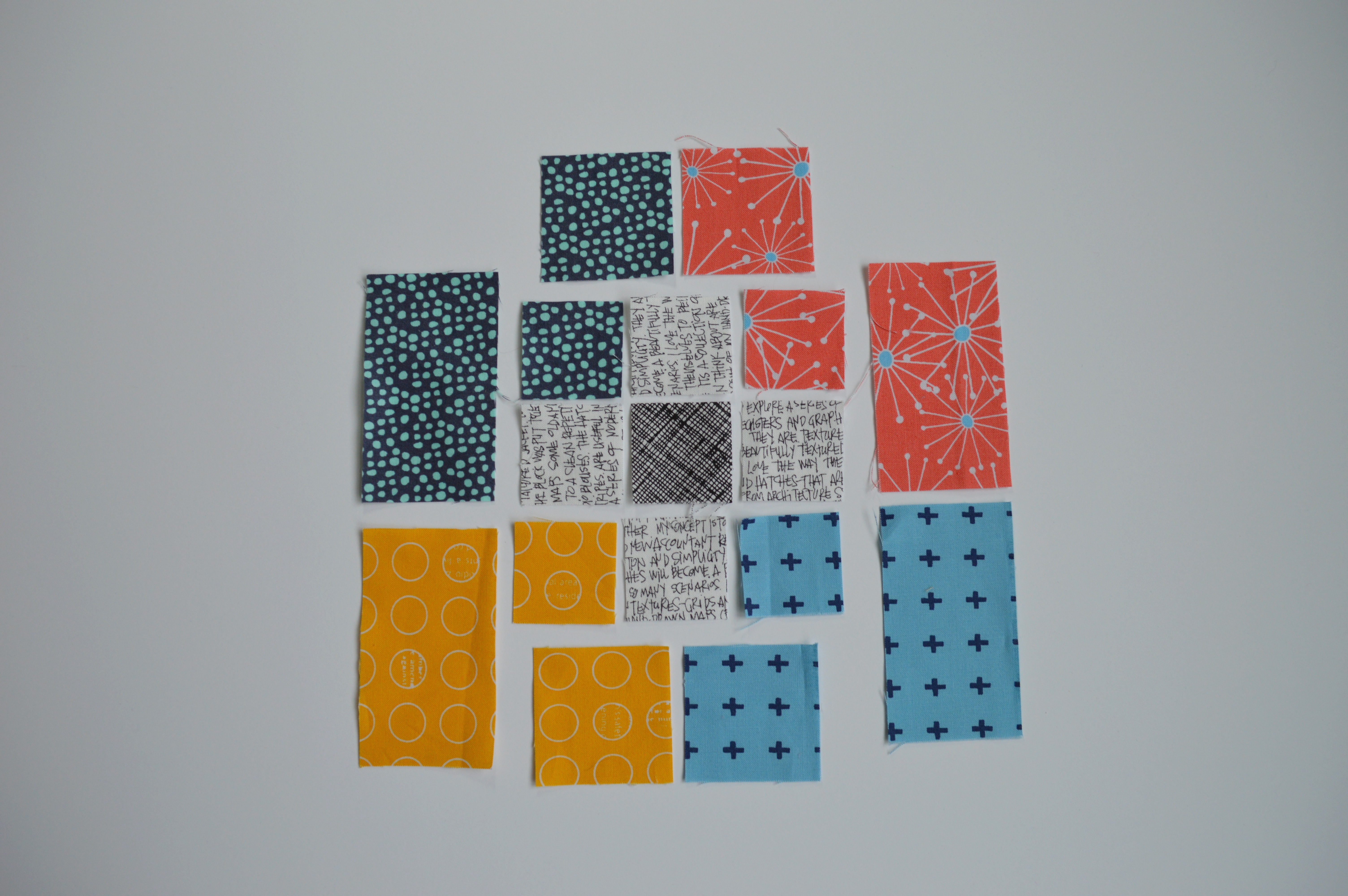 from each of the dark blue, yellow, pink, and light blue: cut (1) 1 1/2″ square, (1) 2″ x 3 1/2″ rectangle, (1) 2″ square