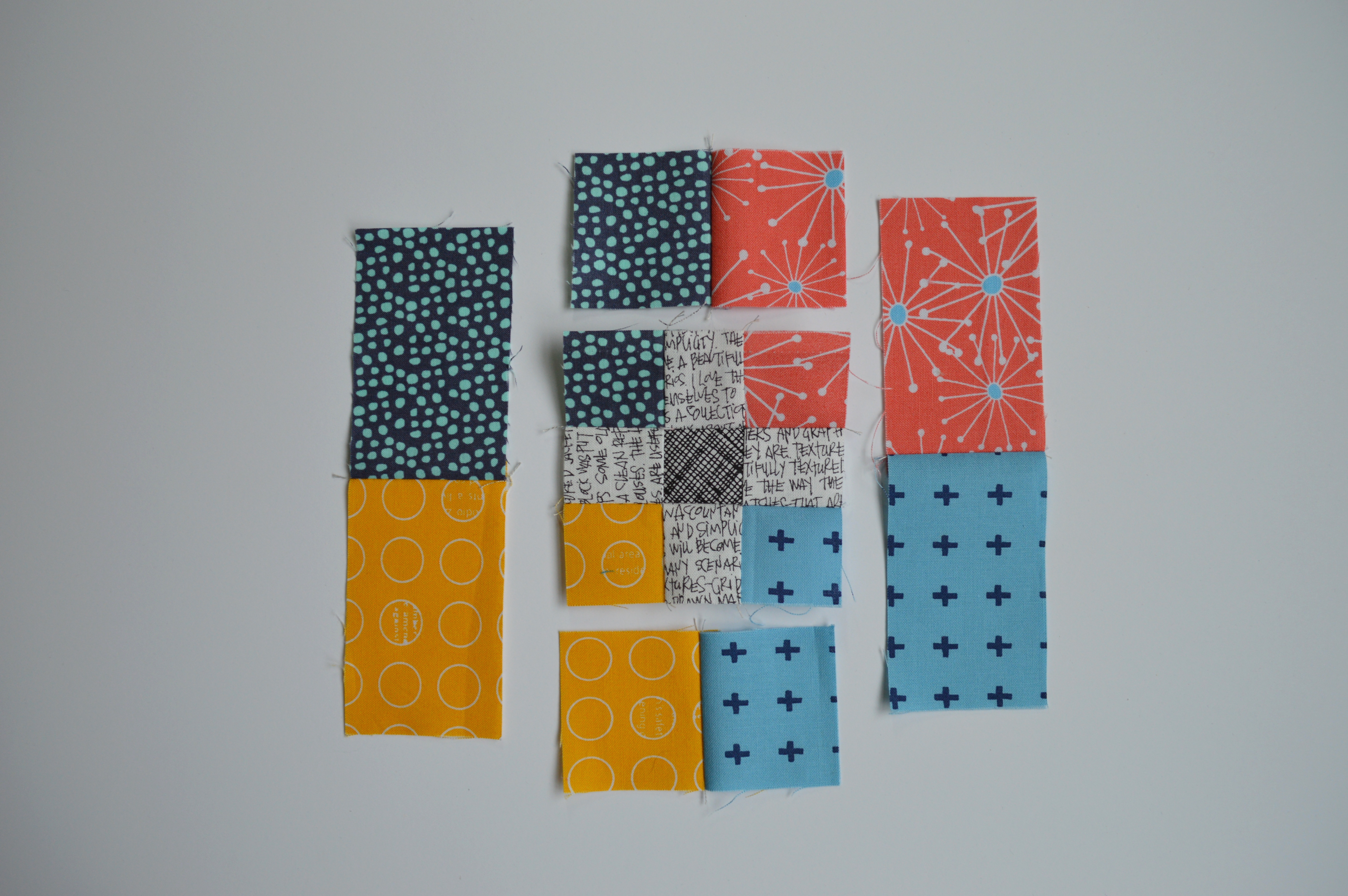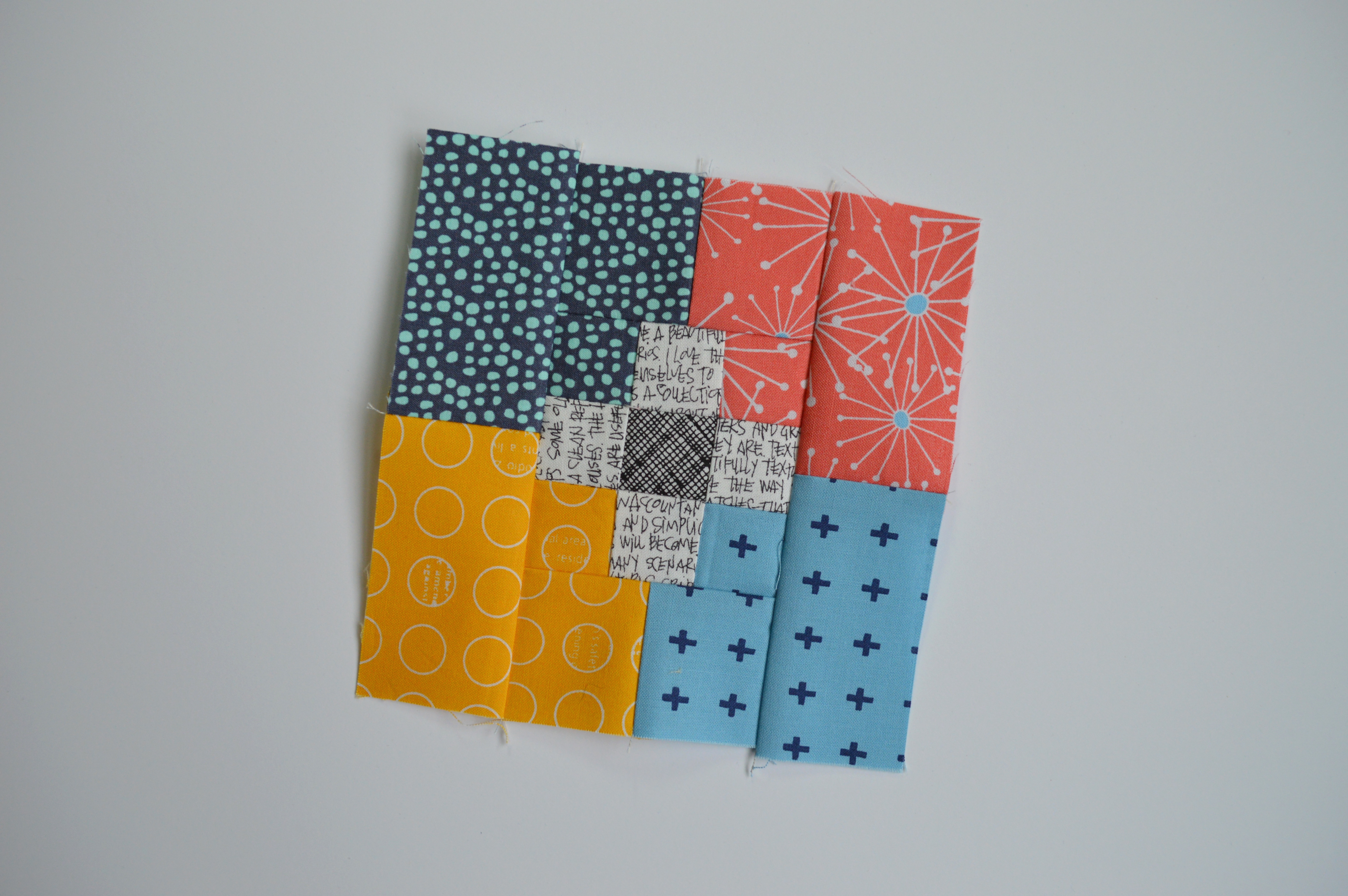 6. sew the rows of the nine-patch unit together. Be careful to keep the colors oriented to the correct corner, so they will finish adjacent to their matching prints. See above.