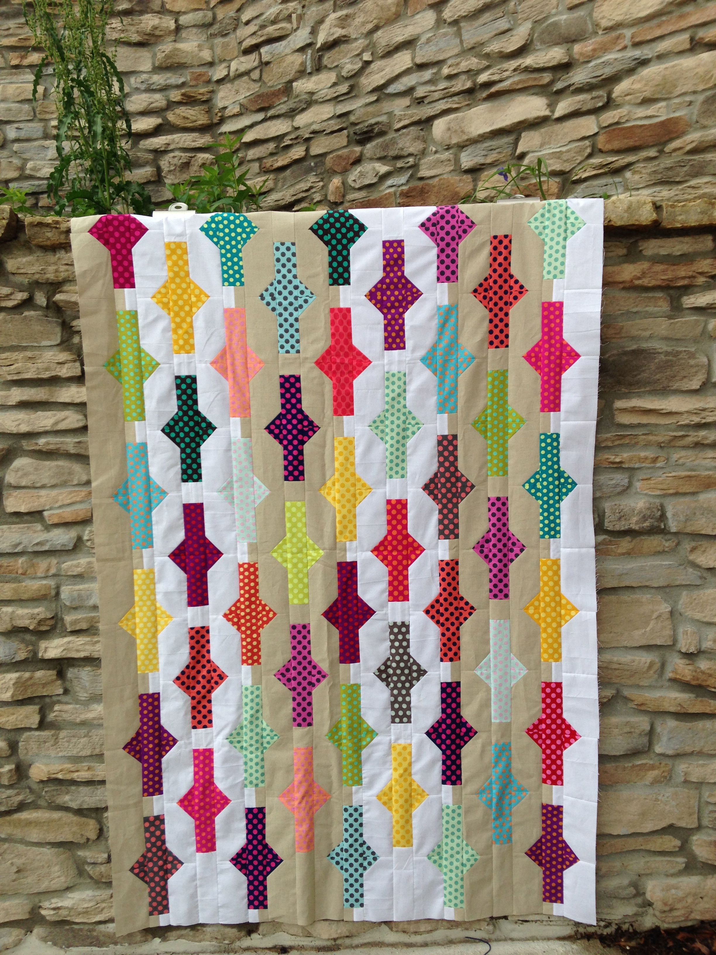“Unidentified” is featured in this month’s issue of Quilt Now, hitting subscribers this week in the UK and coming to the US soon. When I created the design for this one, I specifically wanted to make something really simple, with modern lines, that showed off the cute polka dot fabrics. I absolutely love these dots! Most of them are from the Michael Miller Fabrics collection, “ta dot”, and some are by Kaffe Fassett. These are my favorites because they come in tons of colors, and great (unusual) combinations of colors. They are so bright and cheery, and perfect for adding to any patchwork quilt palette.