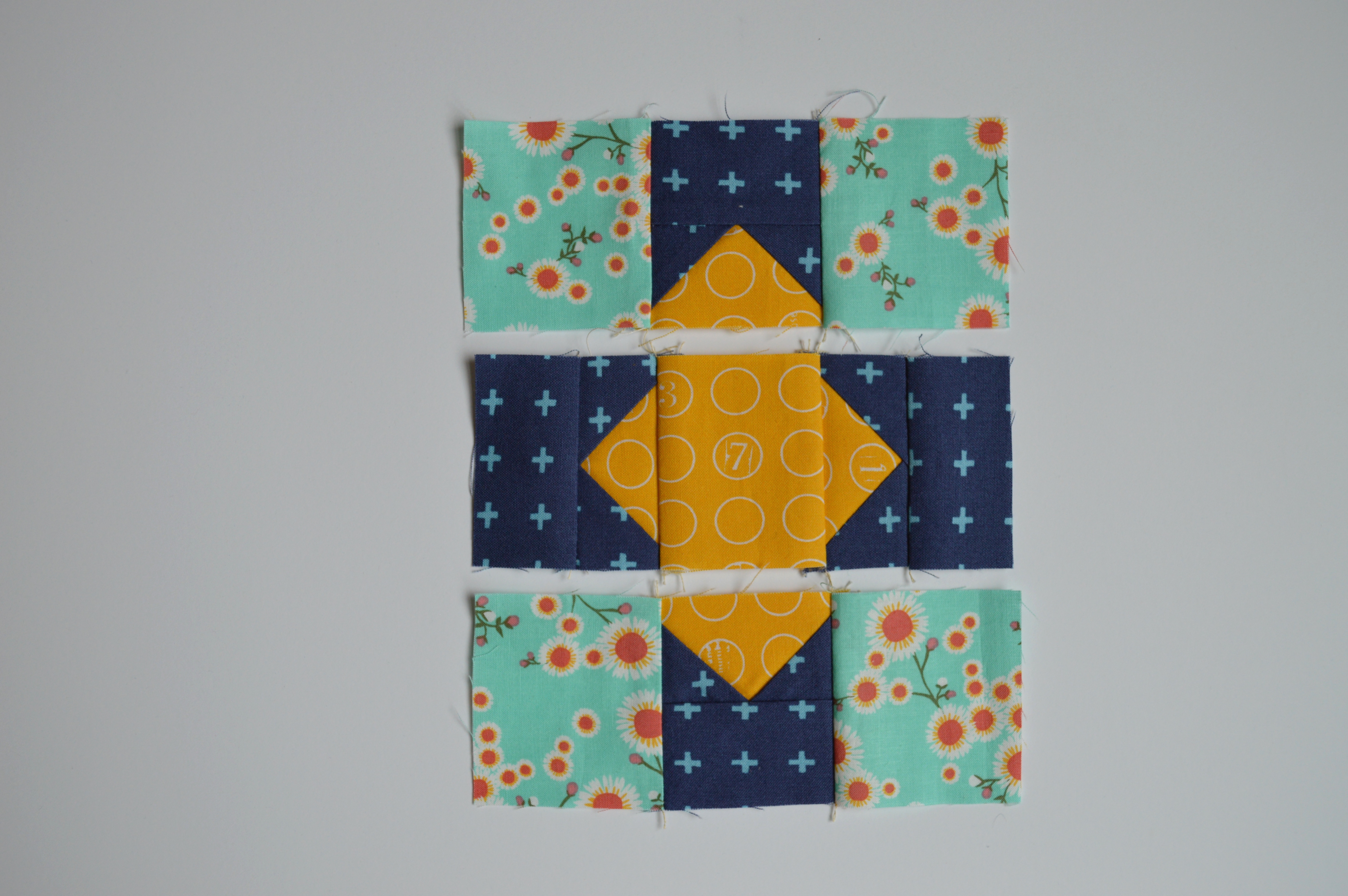 6. Sew the remaining two flying geese units to opposite sides of the yellow 2 1/2″ square. Ensure the geese units are oriented to keep the yellow triangle against the yellow square. Press toward the yellow square.