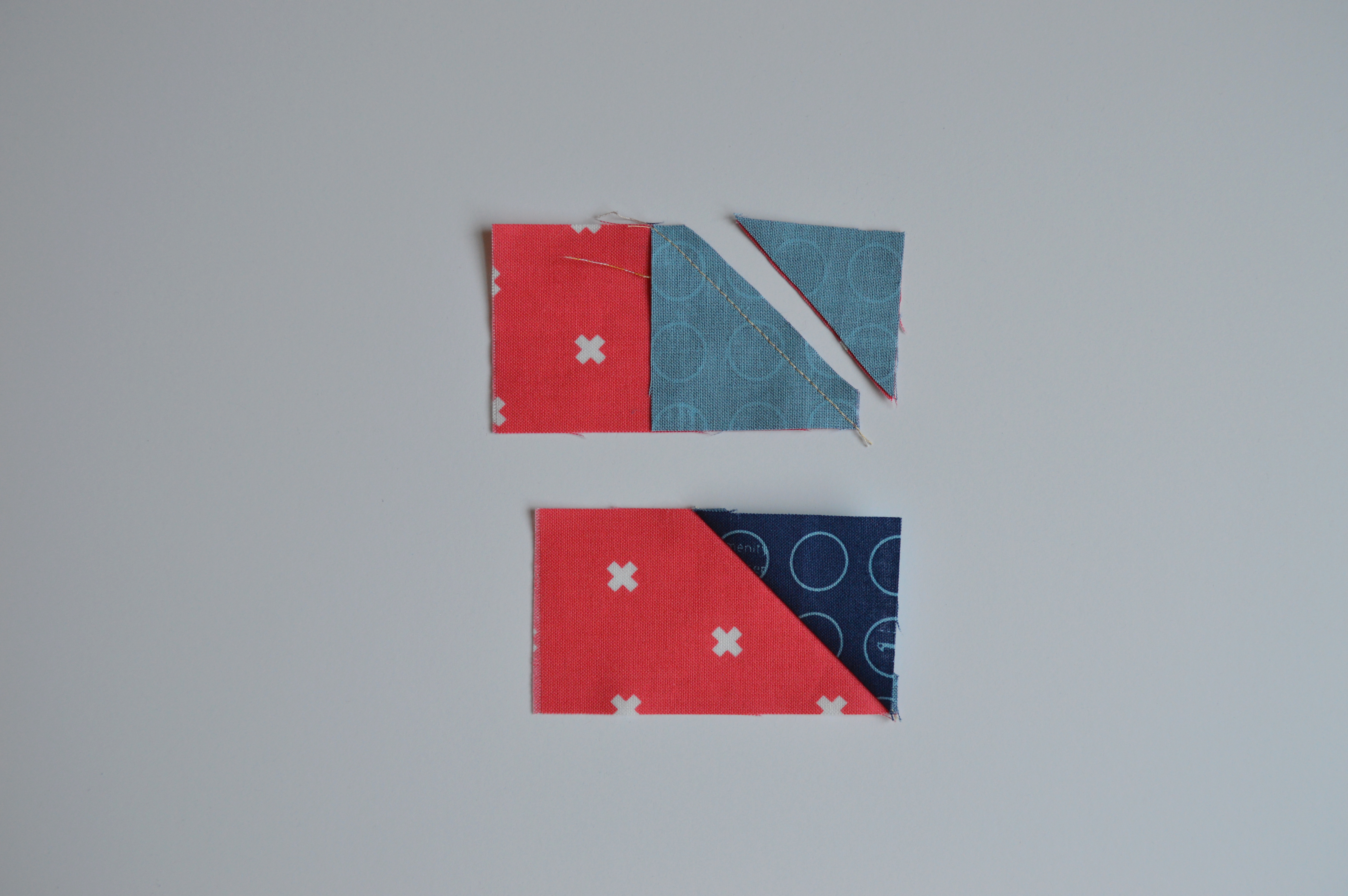 1. place one dark blue square, right sides facing, over a pink rectangle, so it covers the right end. Mark the diagonal of the square, from top left to bottom right, and sew on that line.