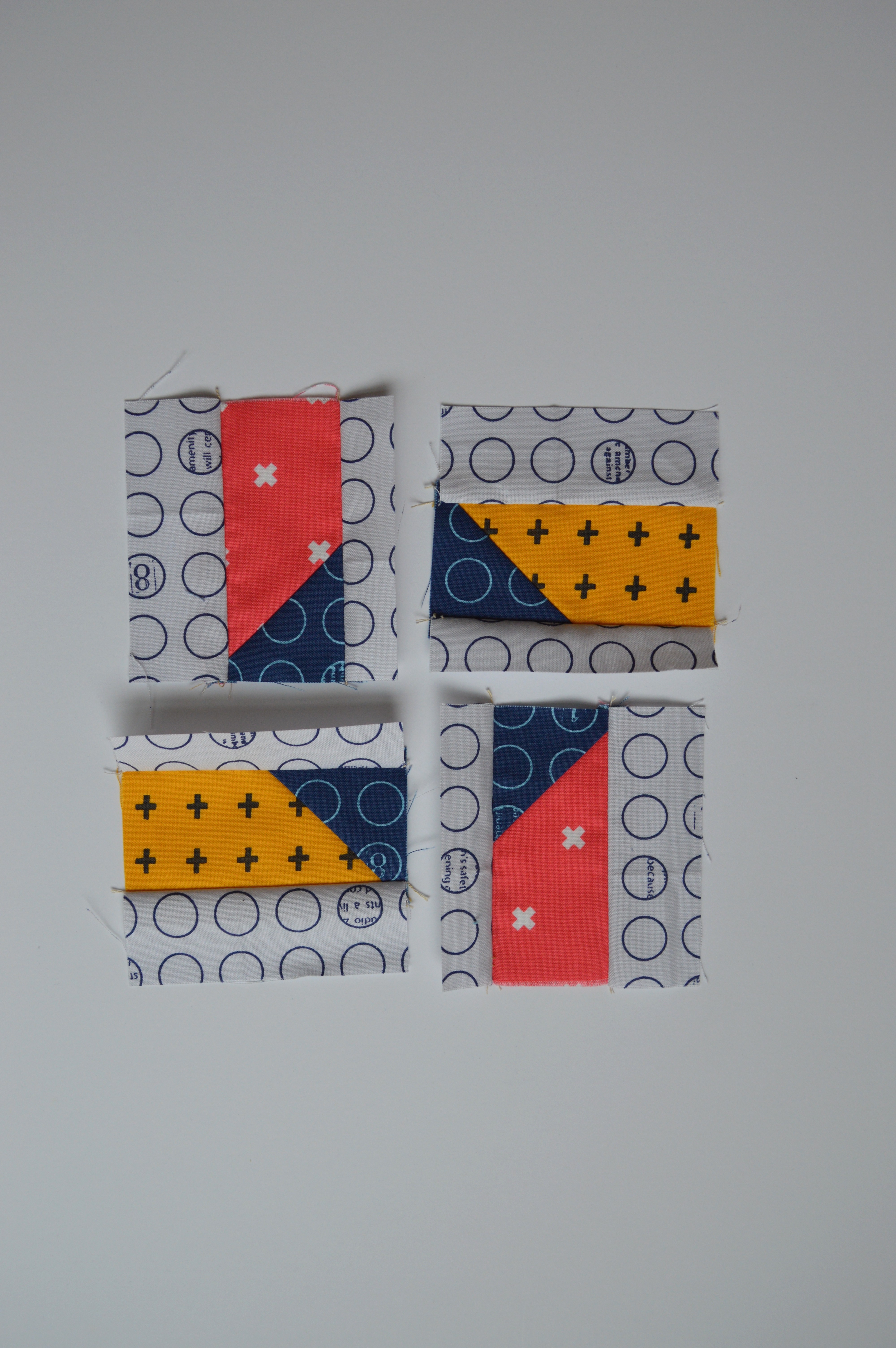 5. Arrange the sewn units so that the pink and yellow form a pinwheel shape and the dark blue squares are oriented to the center of the block. Sew each pink unit to a yellow unit, press toward the gray fabric strips.