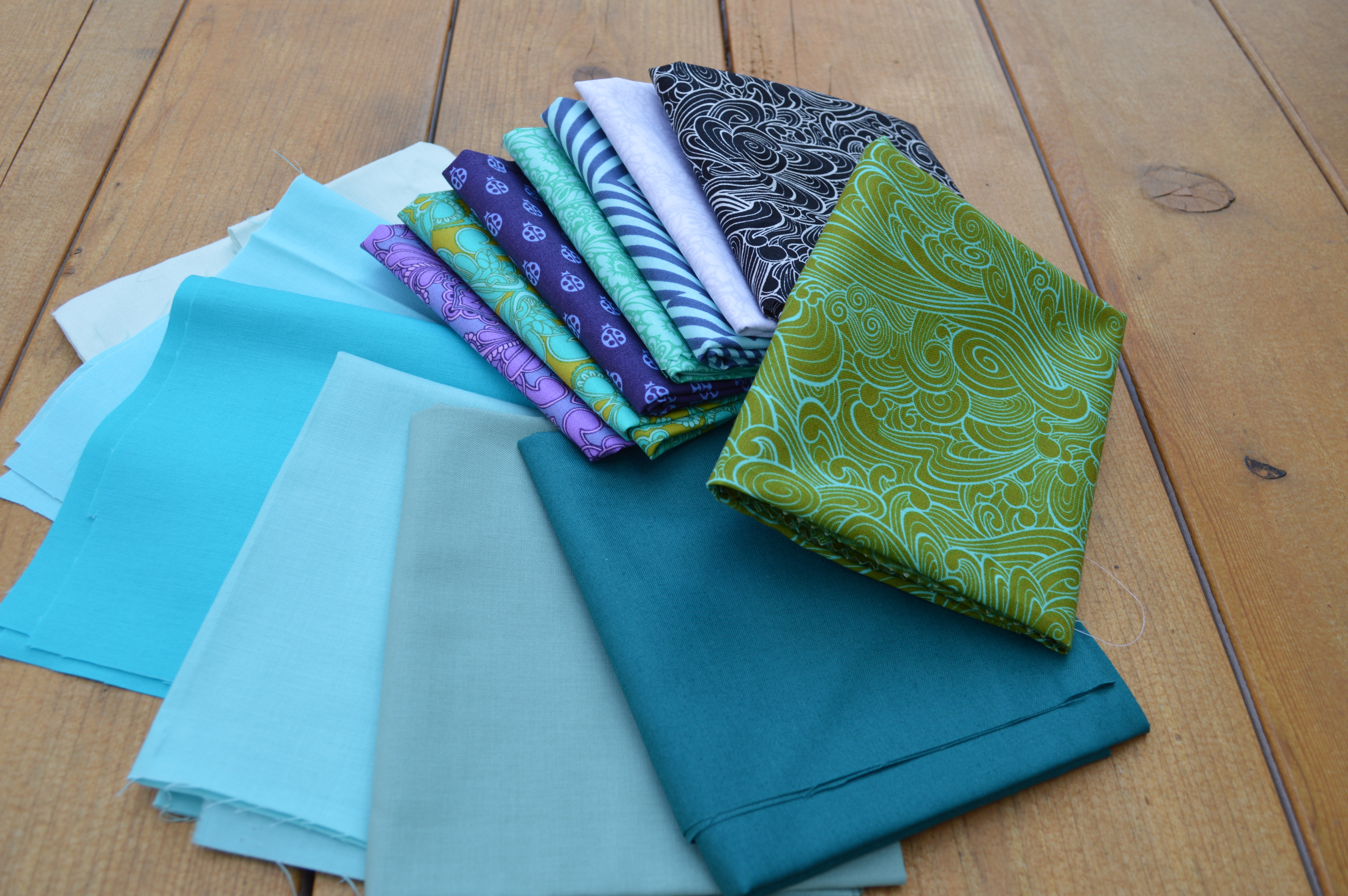 Since I am currently working on a small version of my Polka Dot Bikini quilt pattern, I am in the mood for tone-on-tone. I just love how the True Colors prints look with the light/dark Kona solids from my bundle at Stash! wouldn’t this little grouping be a gorgeous combo for a Bikini quilt? As you can see from my first two combinations, I don’t seem to be in much of a neutral frame of mind…but the True Colors would really pop with white or black as a “background” for piecing, too. If I did want to tone it down a bit, I could always go more monochromatic, pulling the prints in the blue/green range and add shades of blue solids. Quite lovely, and actually rather calm, too.
