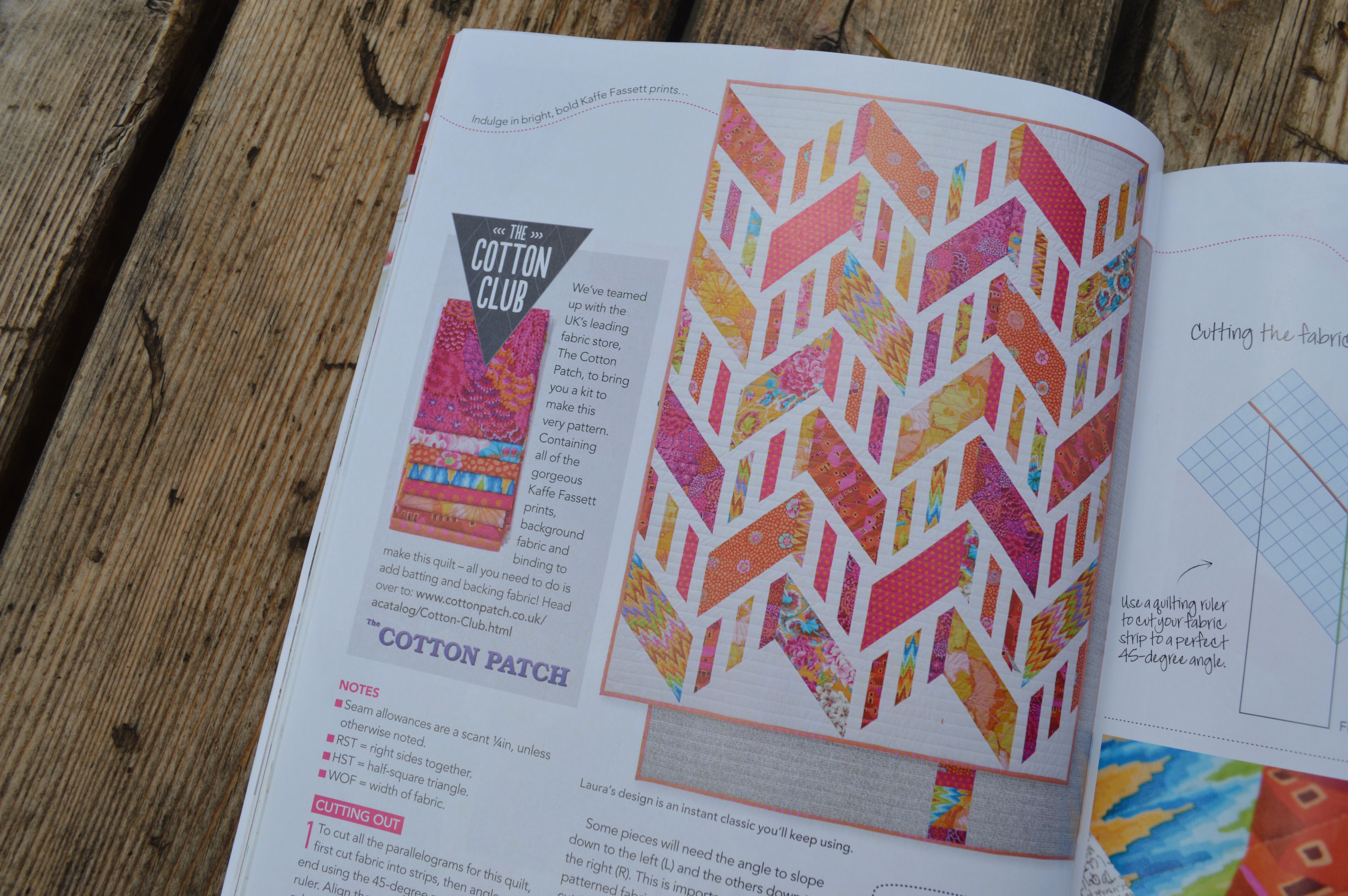 My favorite project in the magazine: “Summer Berry” by Laura Pritchard (@dimplestitch) made with Kaffe Fassett print fabrics in wonderful hot colors. I love the relatively simple design of a classic zig-zag, but the way she made it with the strips inserted is so creative! What a great quilt for using some of your most precious fabrics…big pieces show off the prints and the crisp white background makes the color pop.