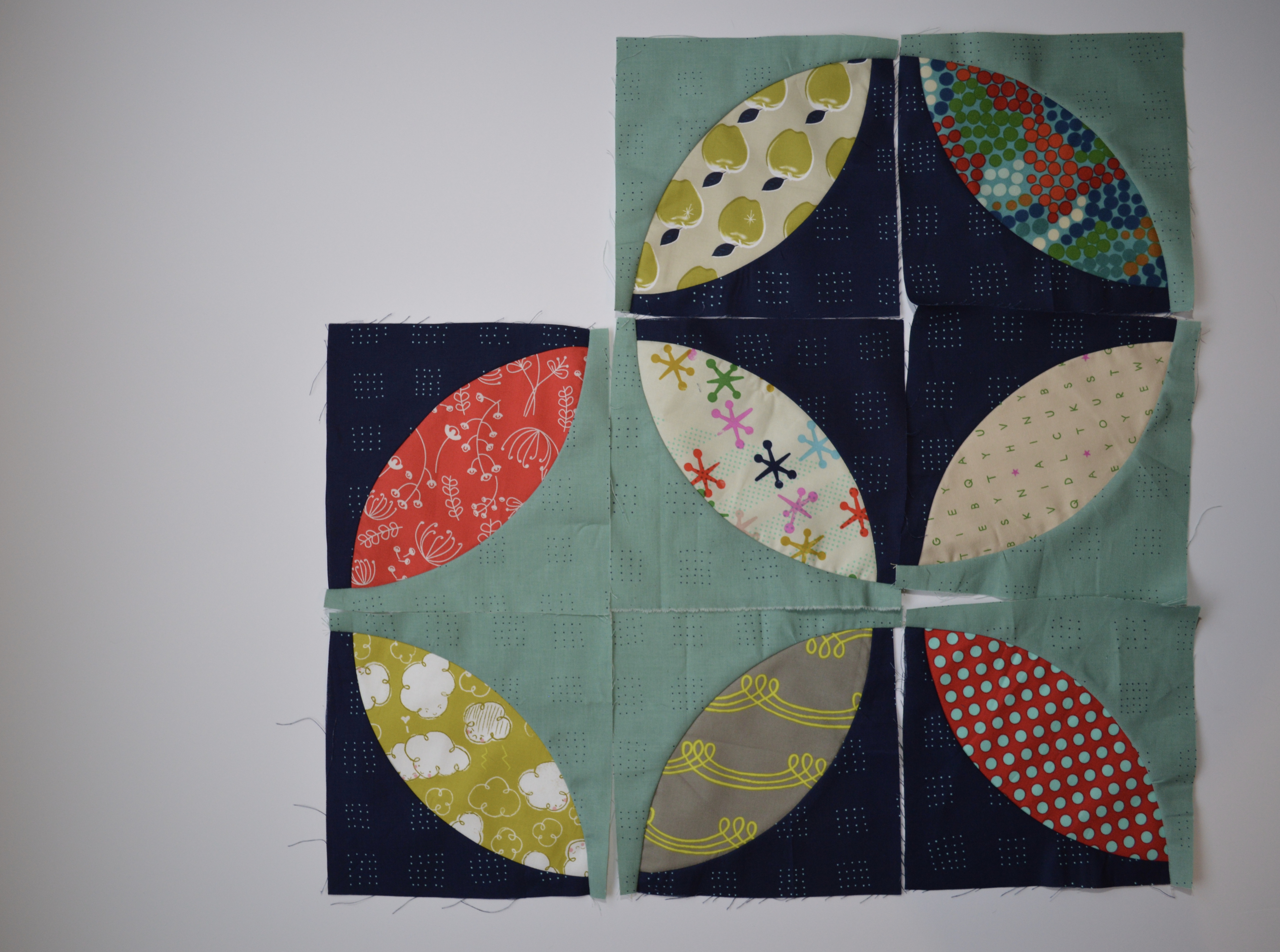 I make maximum use of my time by cutting several of the pieces and keeping them in a plastic pouch with a container of pins. I can take this with me when I know I will be sitting or waiting (soccer practice, watching a movie with my kids) and pin the curves. The pinned units then sit on a corner of my sewing table and I sew one here and there mixed in with whatever project I am currently working on. This is a great way to keep some variety in your sewing and it is so gratifying when you look and realize you have a whole bunch of blocks sewn without making any real effort. Bonus!