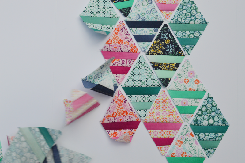 I have cut my Grand Canal prints into equilateral triangles…a shape not often seen in quilts, but one I have been keen to work with more lately. I had this idea to make a really basic quilt with the triangles and mix them with Ombre solids (have you seen the ombre solids by Moda/Vanessa Christensen? They are gorgeous and perfect with Grand Canal).