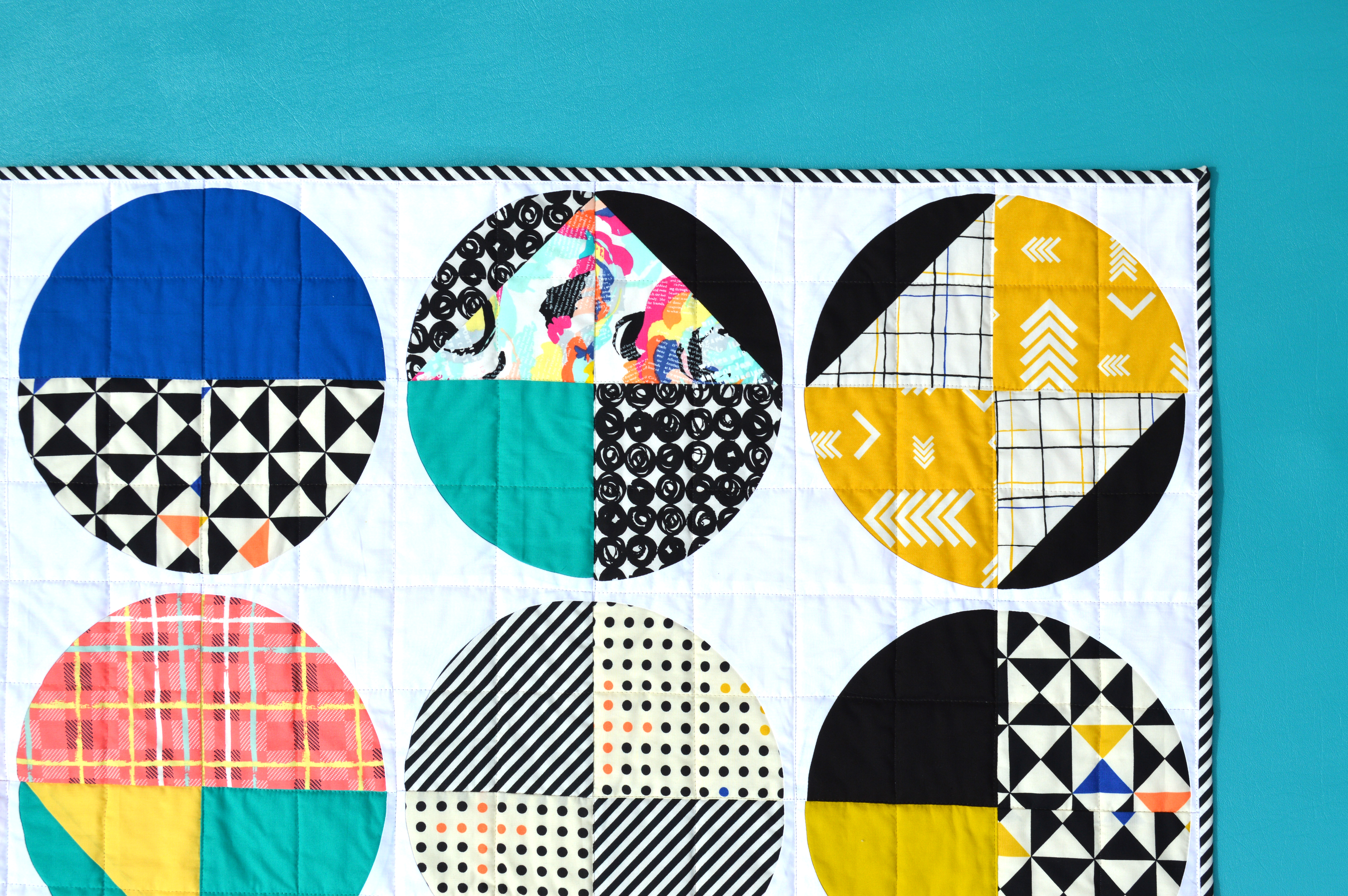 It sure is striking!! I love how the circles play with the fabrics: they work together so well! and the black and white striped binding is the perfect finish to the quilt! Hugs, H