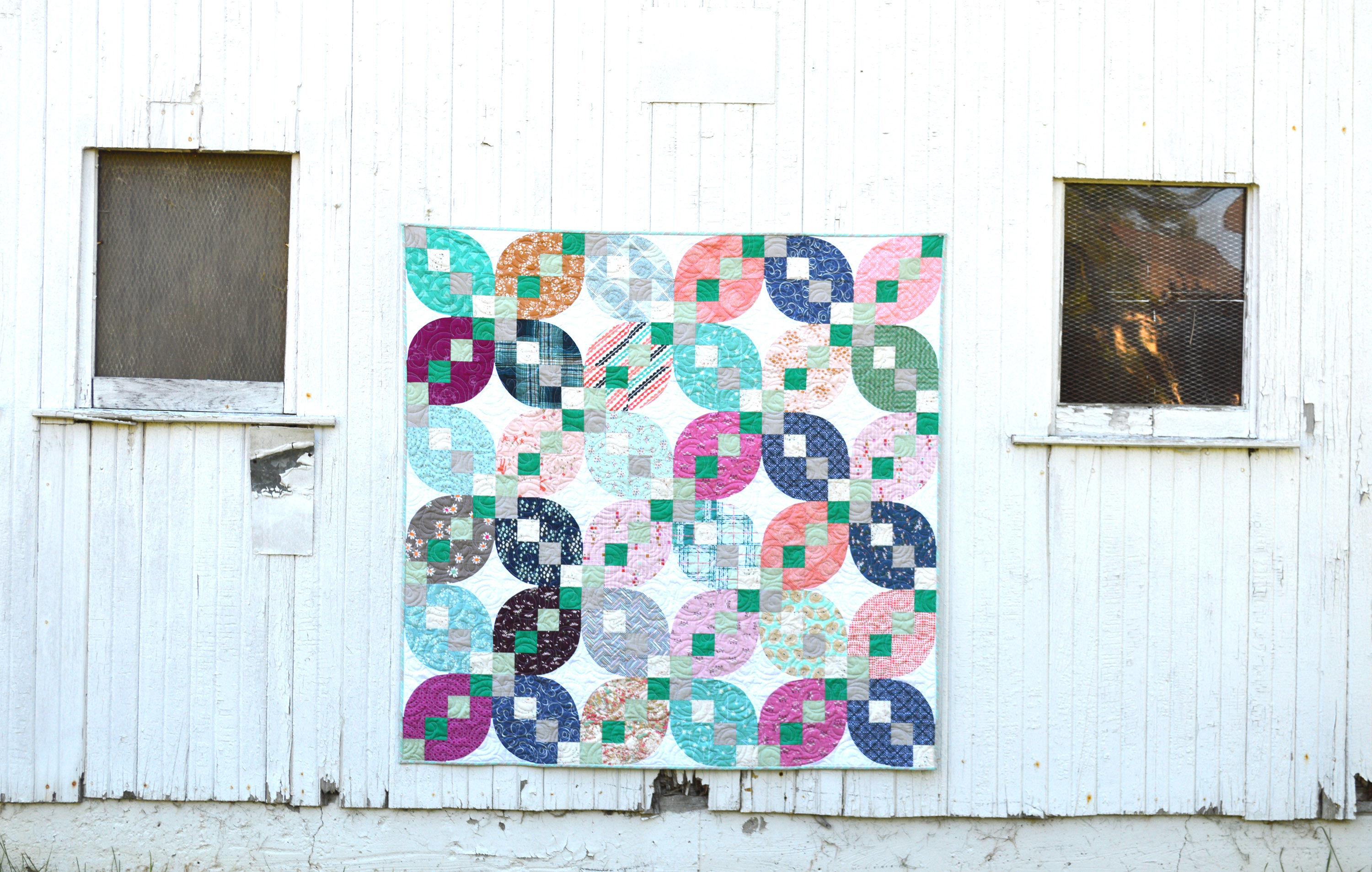 The inspiration for the Petals pattern came from a combination of the classic Jacob’s Ladder block and the Drunkard’s Path curve. I like how you get a mix of designs happening, with oversized flower shapes, curvy diamonds, and crossing checker squares. I used the Playground fabric collection by Amy Sinibaldi for Art Gallery Fabrics for the prints (plus a couple scraps from other AGF collections). I use Aurifil thread for all my piecing and finish with Hobbs batting.