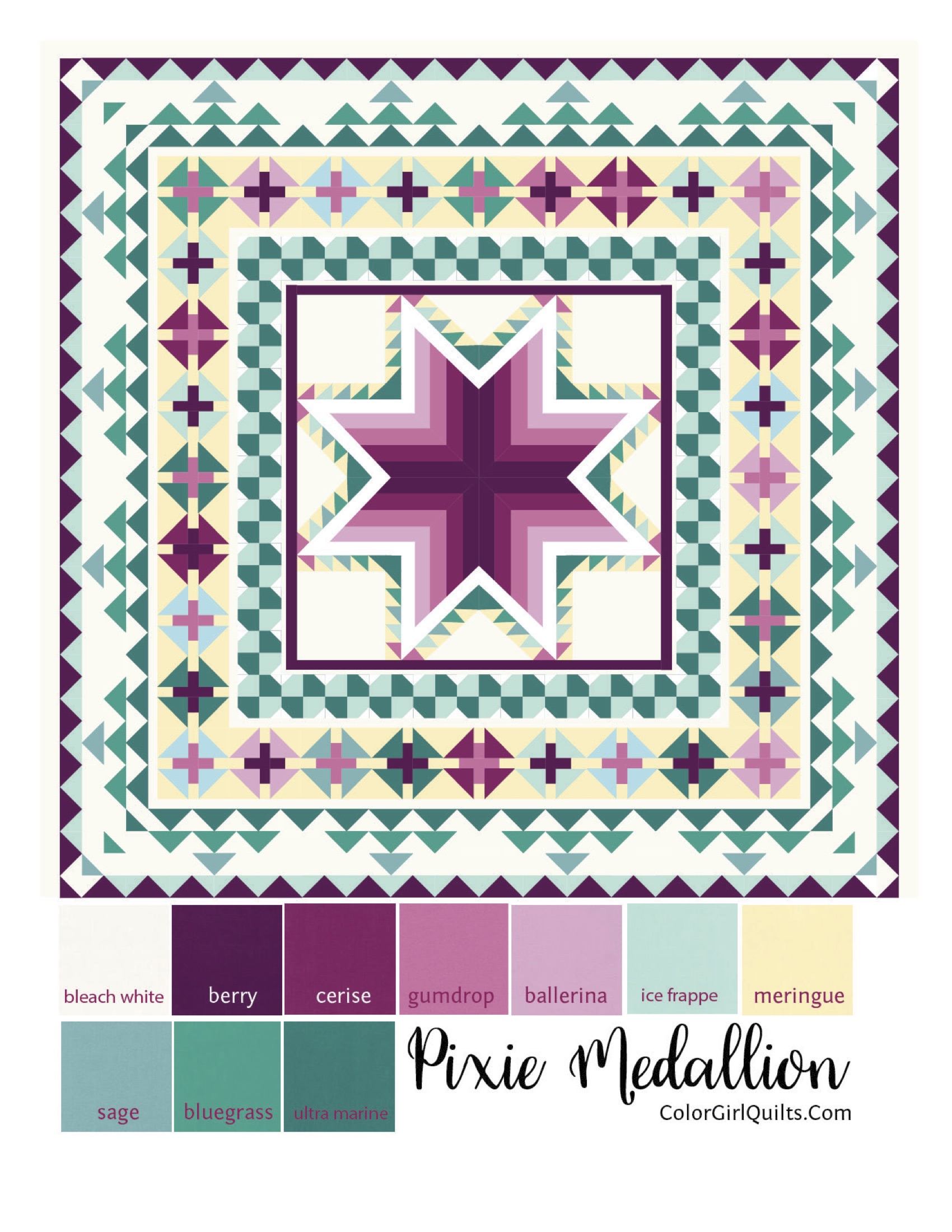 My first idea was to do something completely different from the original. Berries and Bluegrass features Kona cotton solids in shades of purple and green. I love that this is a bit of an unexpected combination, but looks amazing! You can get a kit for Pixie Medallion with these colors from Wendy, Here. And I have also included the colors for my friends around the world if you’d like to do something similar with fabrics in your stash or from your local shop.