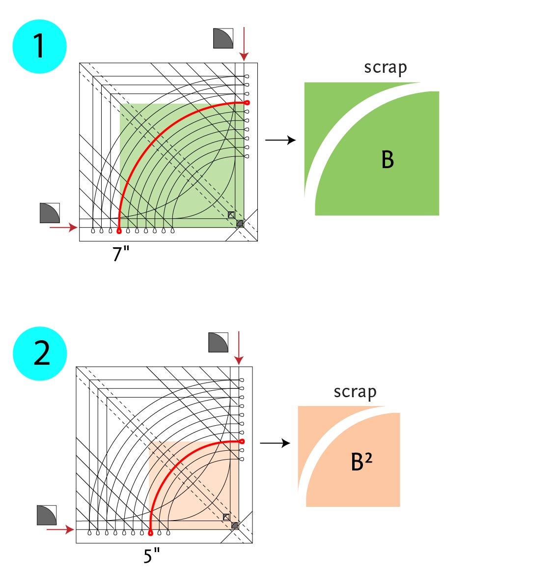 - Place one of the 7″ print squares on the cutting surface. Place the Classic Curves Ruler (CCR) on the fabric so that one corner (two adjacent sides) aligns with the lines on the ruler for cutting the convex shape (see illustration 1 above). Use the 7″ groove to cut the curve. Cut a total of 16 B shapes.