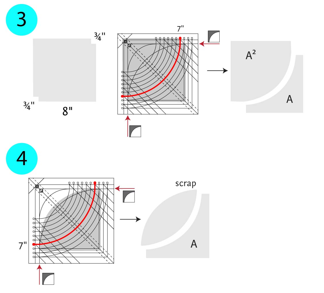 3. Cut 3/4″ squares from two opposite corners of a 8″ white square (see illustration 3 above). Place the CCR over the fabric so that the cut corners align with the lines on the ruler for cutting the concave curve. The 7″ cutting groove should pass through the inside corners of the cut squares. Use the 7″ groove to cut the curve. Set the A shape aside.