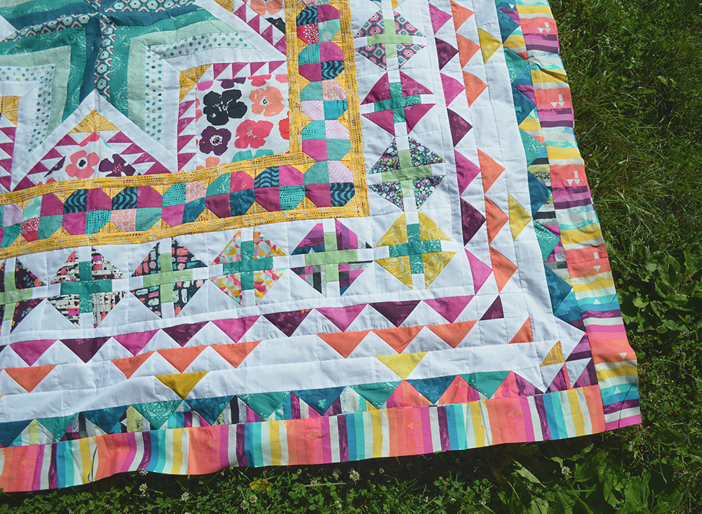 I am happy to report that the top is finished and the backing is sewn up! I’ve arrange to send it to Barbie of The Quilting Mill for custom quilting…so excited to see this one all finished up. The challenge goal really helped give the push needed to get this one done up. It was *so* close to being done when we wrapped up the quilt along in April. All it needed was those final strip borders around the whole thing. The problem was that I needed to buy that striped fabric and that pause was just enough to make the project stall out. Do you ever do that? all gung ho on something, and a tiny delay just throws you all off.