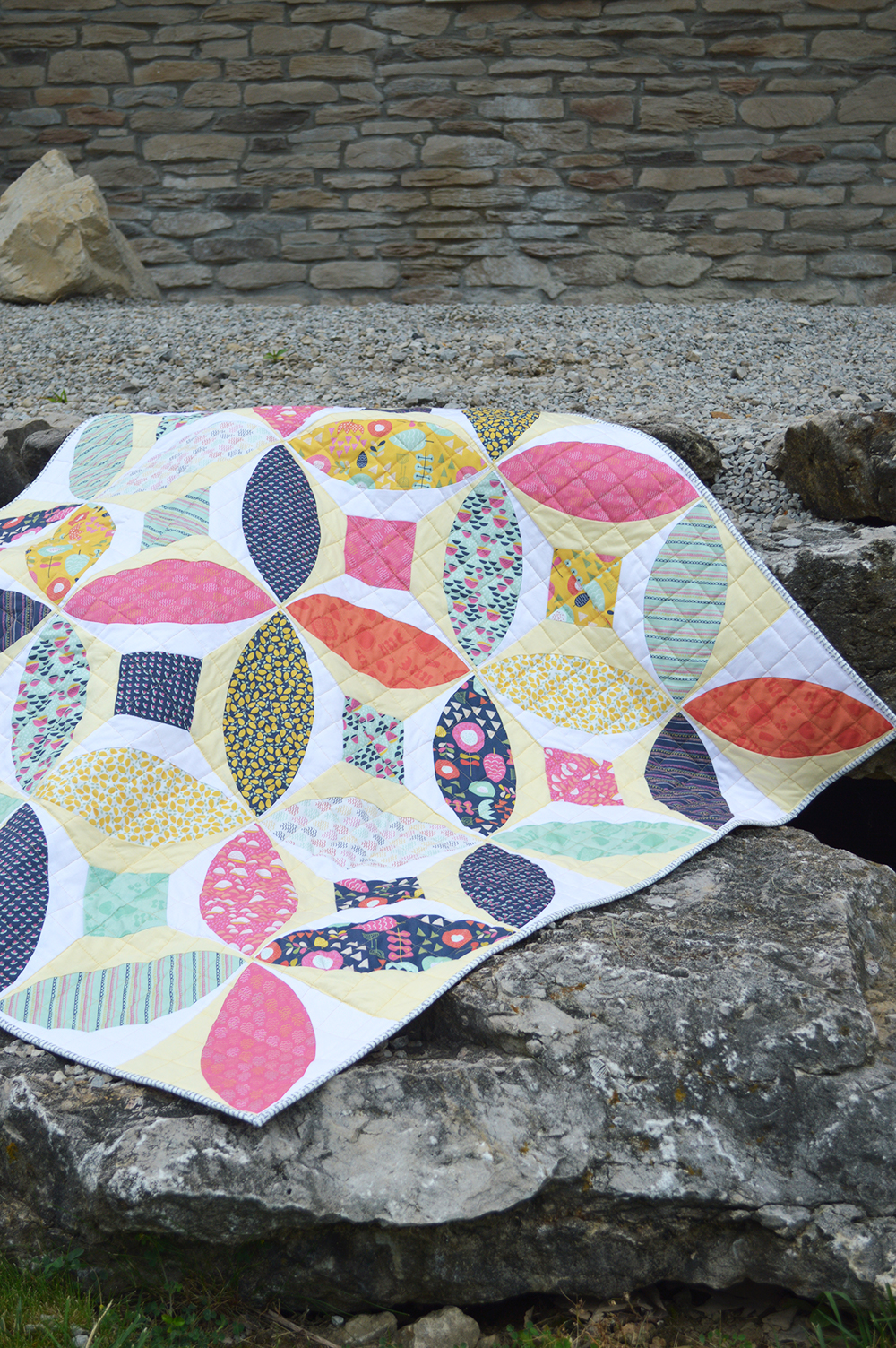 As soon as I saw the prints, I couldn’t resist saying “yes” to the chance to make a quilt. This collection is so pretty: part candy color sweetness, part retro geometric, all really cute prints. I will definitely be watching to see what Kelly creates next.