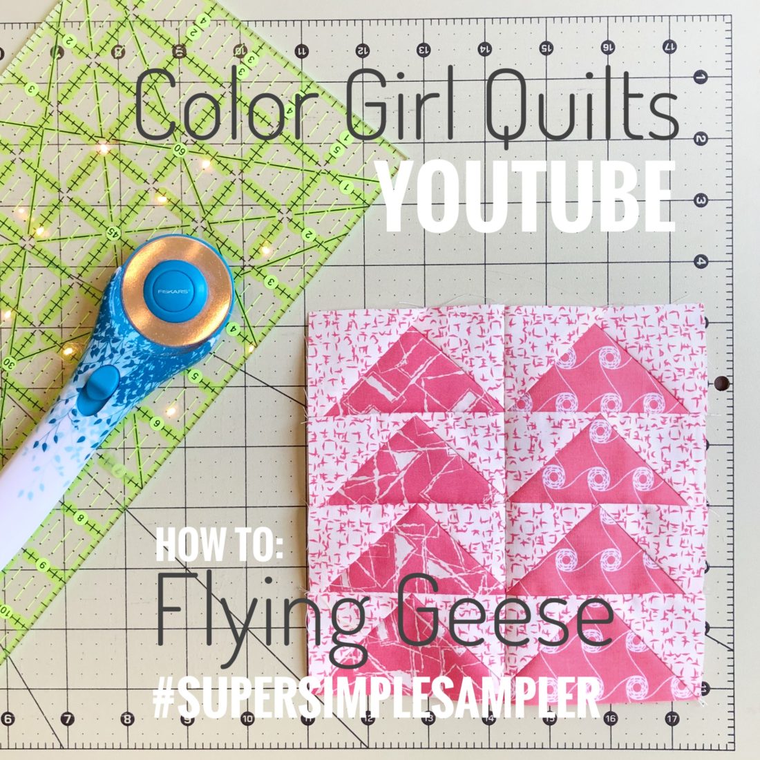 I took a bit of time off, so I’m slightly behind on what I had planned for my Super Simple Sampler blocks. I hope if you are sewing along you are still working away on these cute blocks! This week, the focus is on flying geese units. These little block units are key to lots of traditional quilt blocks and the technique is a must for your quilting toolkit. (Besides, they are just so cute and versatile!)How to sew flying geese units for quilts, video tutorial by Color Girl Quilts