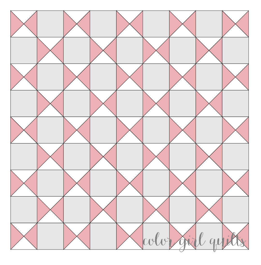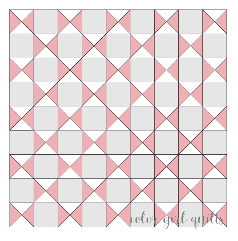 For this version, I am going to make 40 blocks (the 36 featured, plus four of them twice with different fabrics), then set them alternating with hourglass blocks in pink and white (like shown in the drawing above). I’ll post those instructions during the month as we are sewing. This will make a 48″ x 54″ quilt. In addition to the fabrics for your blocks, you’ll need 1 1/8 yard of each of two colors to sew the hourglass setting blocks and 1/2 yard for binding.