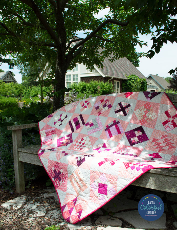 I really like this setting of the sampler blocks alternating with the pink hourglass blocks for a couple reasons: first, it allows you to make a larger quilt with fewer sampler blocks. The hourglass blocks are very quick and simple to sew up (watch a video how-to here).