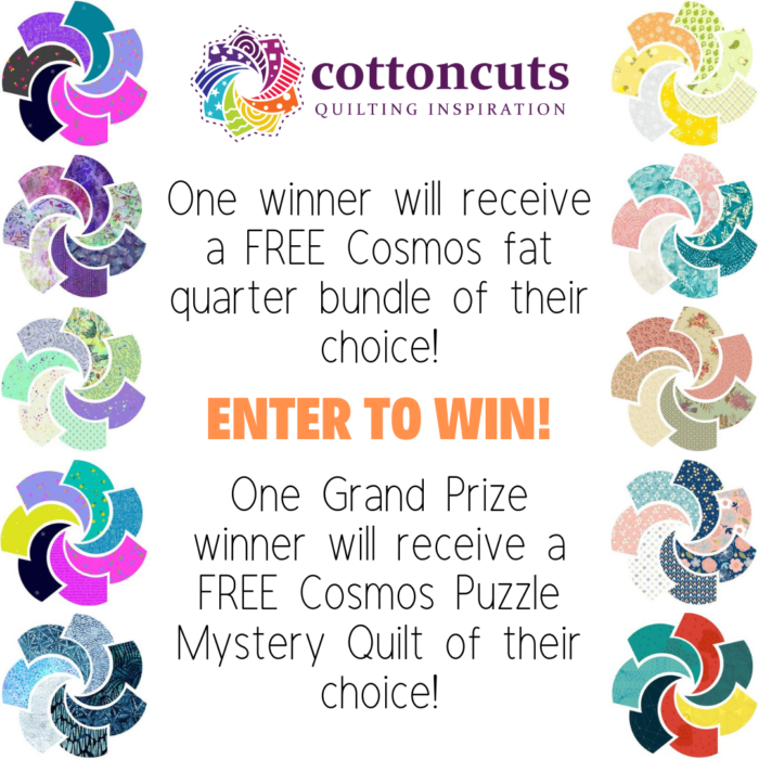 Cotton Cuts Fall 2019 Puzzle Mystery “Cosmos” Quilt Along starts in July! Cotton Cuts is hosting a charity quilt along and I am helping as a host one of the months. Our quilt along lasts nine months and each month is a different clue shared by some of your favorite instagrammers and bloggers (that’s me!). We are starting it all off with a GIVEAWAY!