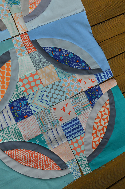 For our Polka Dot Bikini quilt along schedule, you should have four more border blocks and the last of the center blocks sewn up. How did you do?